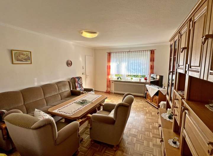 Vom Flur abgehend befindet sich die Küche mit angrenzendem Wohnzimmer, welches mit Stäbchenparkettboden ausgestattet ist.