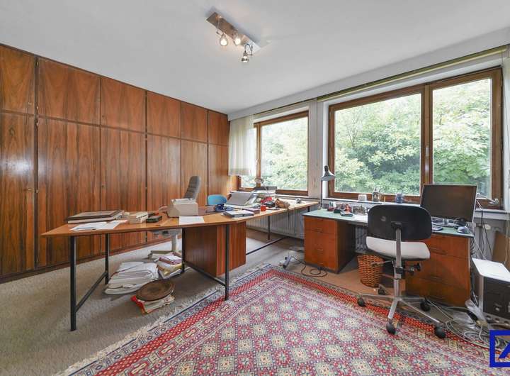 Das freistehende Haus wurde 1970 in massiver Bauweise errichtet und überzeugt durch eine großzügige Aufteilung und viel Tageslicht. Im Erdgeschoss empfängt Sie ein einladender, heller Eingangsbereich. Der offene Wohn- und Essbereich mit großer Fensterfront zum Garten ist das Herzstück des Hauses – hier sorgt ein Kamin für gemütliche Stunden in der kühleren Jahreszeit. Direkt angrenzend liegen die Küche sowie ein großzügiges Arbeitszimmer mit schönem Blick ins Grüne. Ebenfalls im Erdgeschoss befinden sich ein Hauswirtschaftsraum sowie ein Gäste WC.