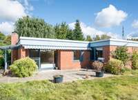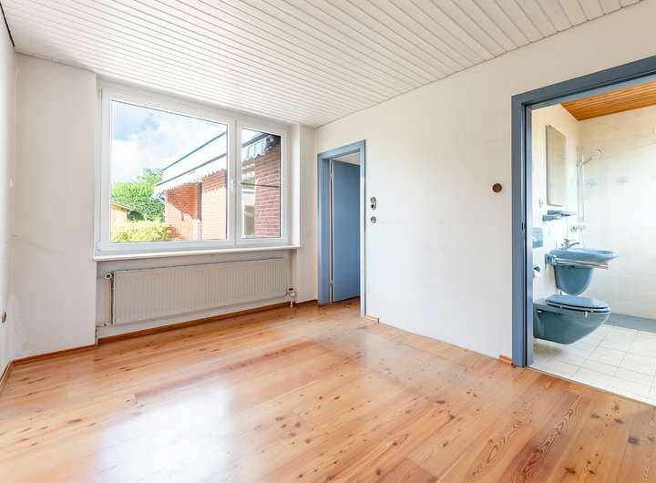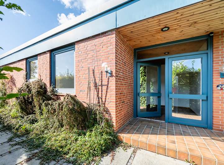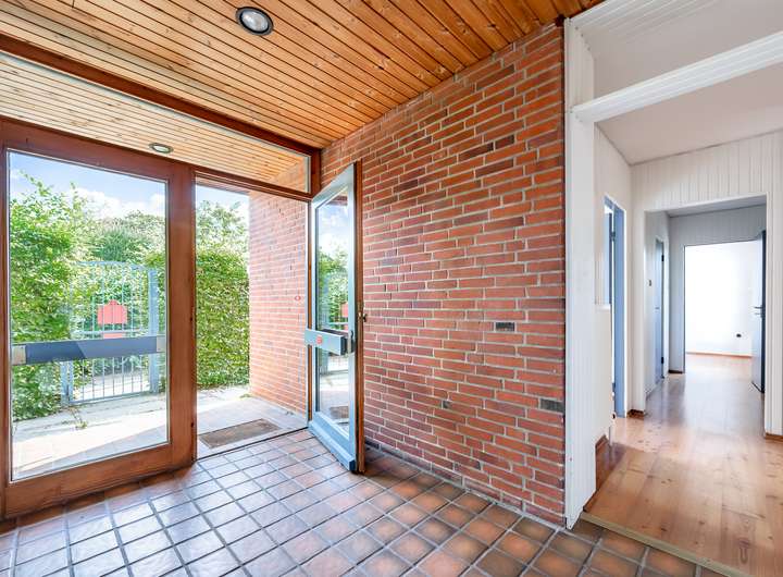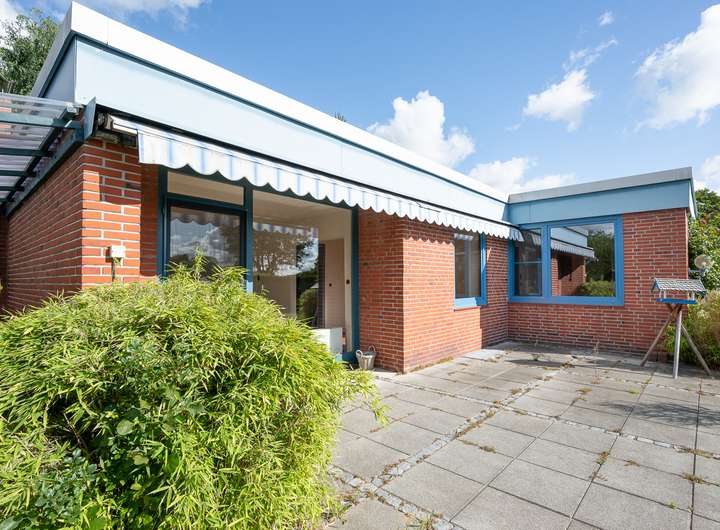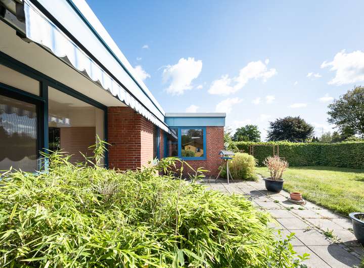 Das im Jahr 1968 errichtete Einfamilienhaus präsentiert sich als klassischer Winkel-Bungalow in solider Bauweise. Die typisch norddeutsche, rote Klinkerfassade verleiht dem Gebäude einen zeitlosen Charakter, während große Fensterflächen für lichtdurchflutete Wohnräume sorgen. Besonders reizvoll sind die in Himmelblau gestalteten Fensterrahmen, die harmonisch mit der gleichfarbigen Attika korrespondieren.