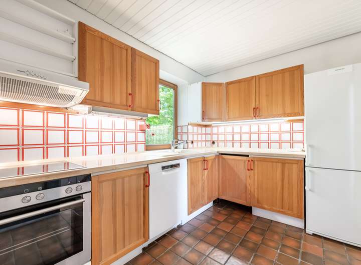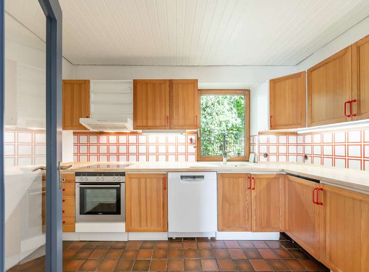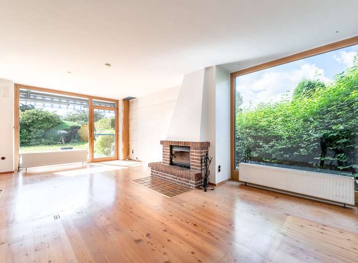 Der großzügige Wohnbereich mit Kamin und direktem Zugang zur Terrasse bildet das Herzstück des Hauses. Durch die breite Fensterfront öffnet sich der Raum zum Garten und vermittelt ein luftiges Wohngefühl. Angrenzend liegt der Essbereich, der sich harmonisch zwischen Wohnen und Küche einfügt und gesellige Mahlzeiten im Familienkreis oder mit Gästen ermöglicht. Die Küche selbst ist funktional geschnitten und bietet ausreichend Platz für Stauraum und Arbeitsflächen.