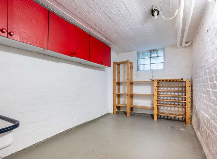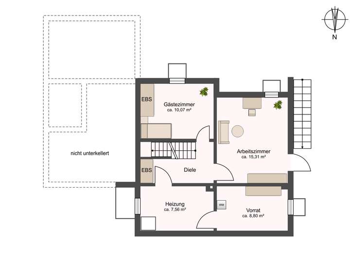 Der teilunterkellerte Bereich erweitert die Nutzungsmöglichkeiten erheblich. Hier stehen ein Gästezimmer, ein Arbeitszimmer mit separatem Außenzugang sowie ein Vorratsraum zur Verfügung. Zusätzlich beherbergt der Keller den Heizungs- und Hausanschlussraum.