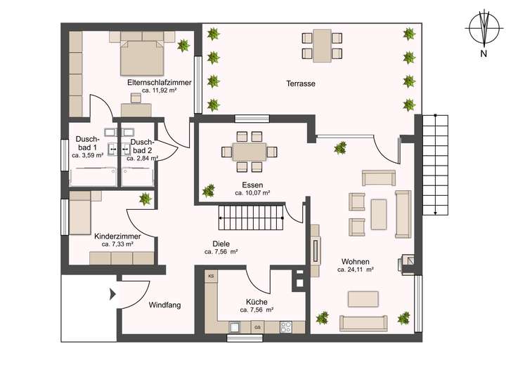 Das Erdgeschoss verfügt darüber hinaus über ein Elternschlafzimmer sowie ein Kinderzimmer, die jeweils hell und gut proportioniert sind. Zwei Duschbäder – eines direkt vom Elternschlafzimmer zu begehen – sorgen für Komfort im Alltag. Die klare Grundrissgestaltung erlaubt eine flexible Nutzung der Räume und bietet eine ideale Grundlage für Paare, Familien oder auch altersgerechtes Wohnen auf einer Ebene.