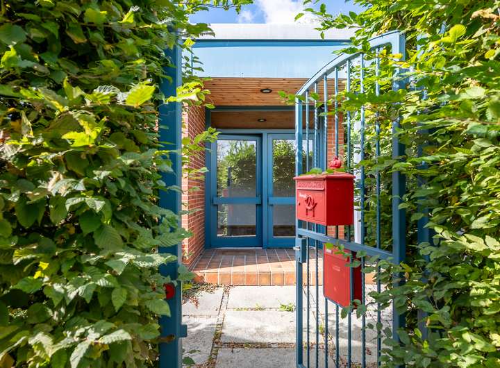 Die zurückgesetzte Lage zur Straße schafft eine angenehme Ruhe, während der Zugang über das vordere Gartentor einladend wirkt. Zusammen mit der Terrasse, der Rasenfläche und den geschützten Grünzonen bildet das Grundstück ein stimmiges Umfeld, das den Charakter des Hauses unterstreicht und viel Potenzial für individuelle Ideen bereithält.