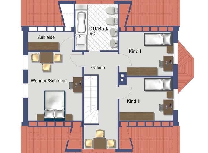 Das Erdgeschoss beherbergt zudem ein komfortables Schlafzimmer und ein modernes Duschbad. Im Obergeschoss finden Sie zwei weitere Schlafzimmer, ein luxuriöses Badezimmer mit Eckbadewanne und Dusche sowie ein großzügiges Elternschlafzimmer mit Ankleidebereich.