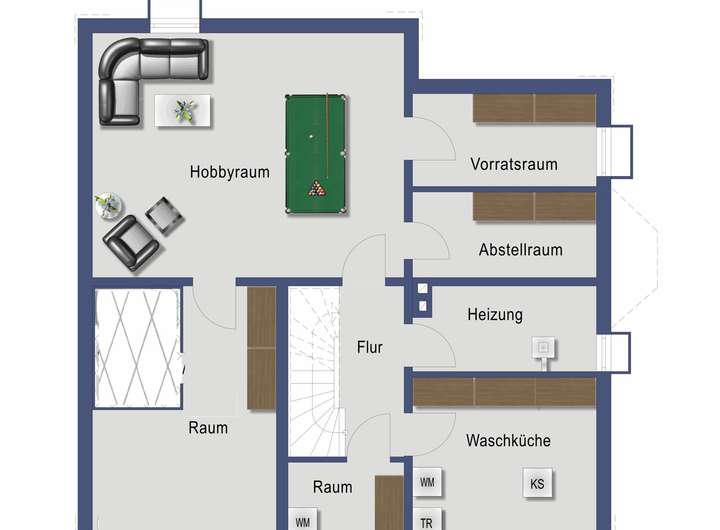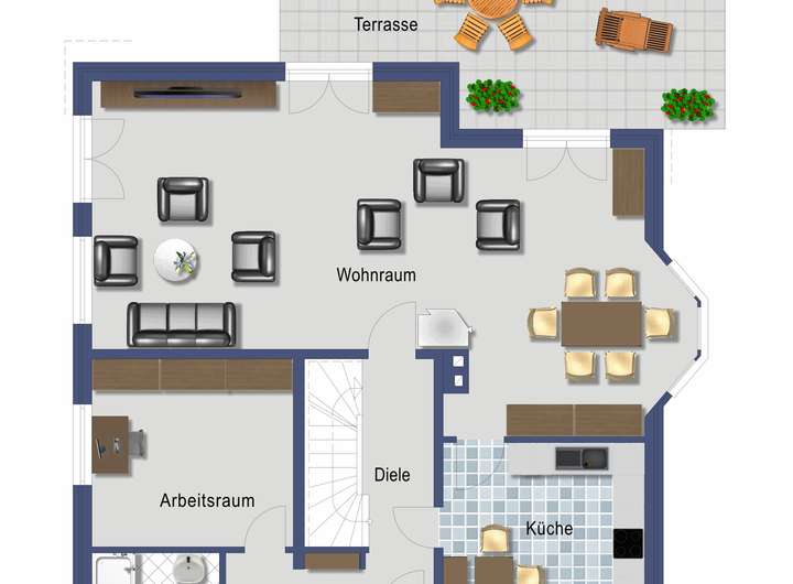 Beim Betreten des Hauses empfängt Sie eine einladende Diele, die direkt in den offenen Wohn-Essbereich führt. Hier sorgt ein eleganter Kamin für eine behagliche Atmosphäre. Die angrenzende Küche ist mit einer hochwertigen Einbauküche ausgestattet und bietet ausreichend Platz für kulinarische Kreationen.