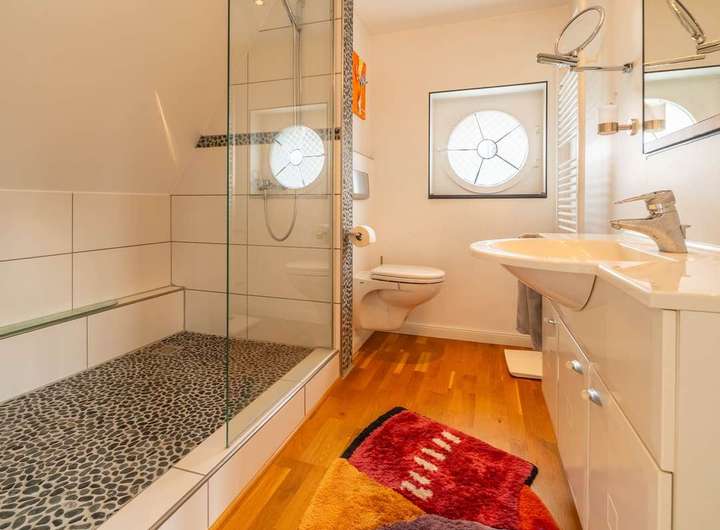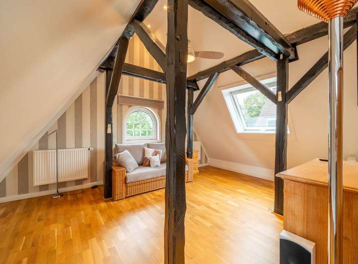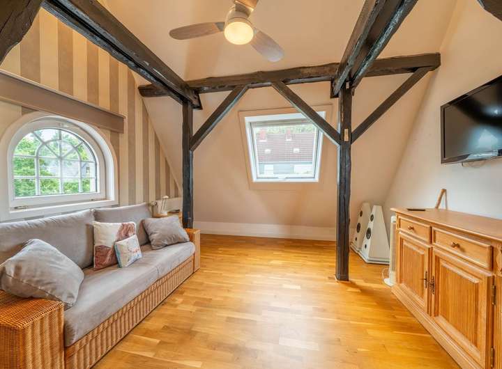 Der Spitzboden ist als offene Studiofläche ausgebaut und verfügt über ein weiteres Zimmer mit eigenem Duschbad.