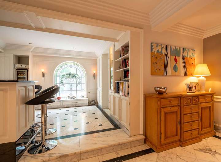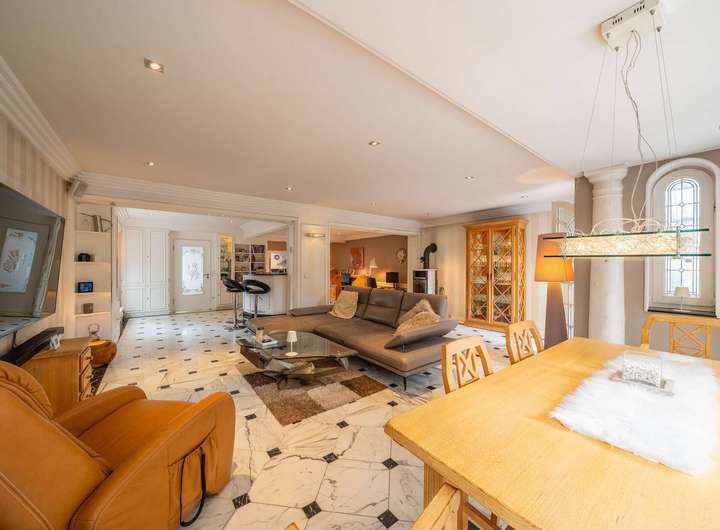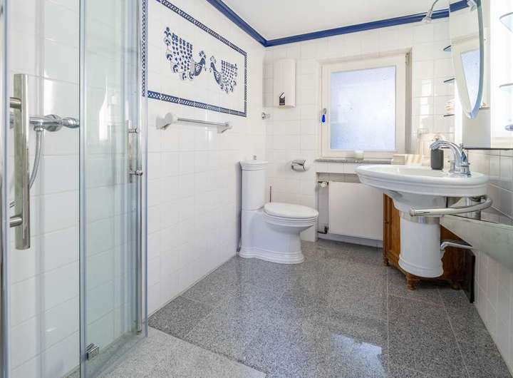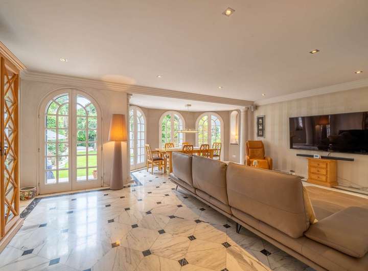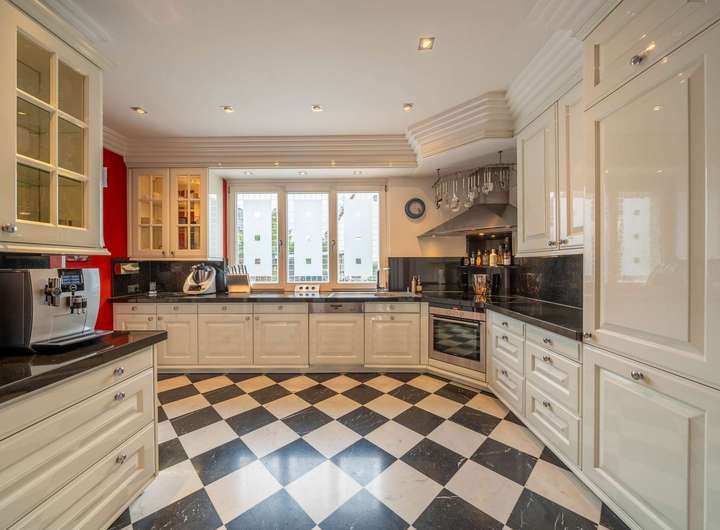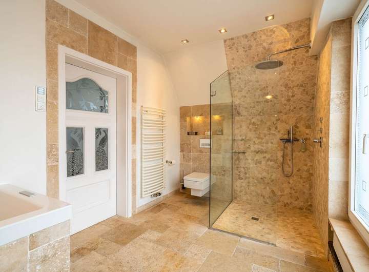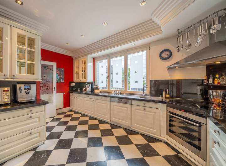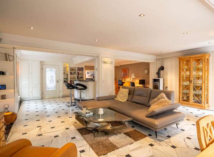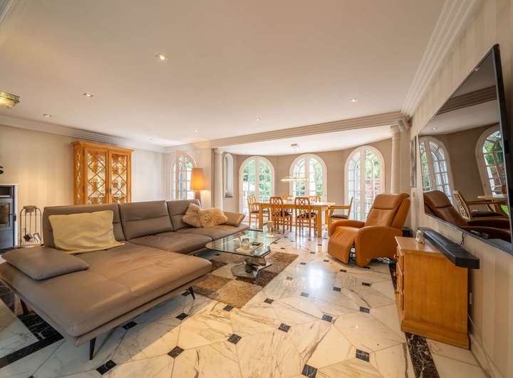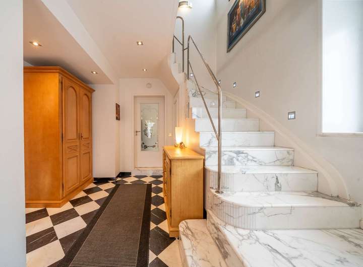 Besondere Stilelemente wie Marmorböden, teils in Schachbrettoptik, Holz-Sprossenfenster, Fenster mit Glaskunst sowie verschließbare Fensterläden prägen den unverwechselbaren Charakter. Ergänzt wird dies durch Echtholzparkett im Dachgeschoss, weitere Marmordetails im Innenbereich und eine große Terrasse im Garten mit Travertinsteinen.