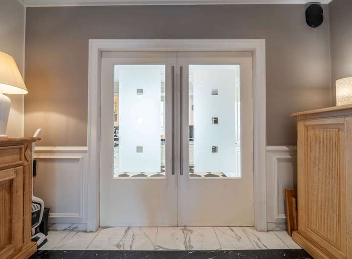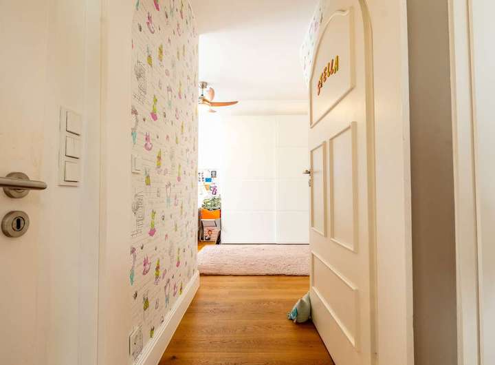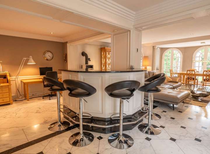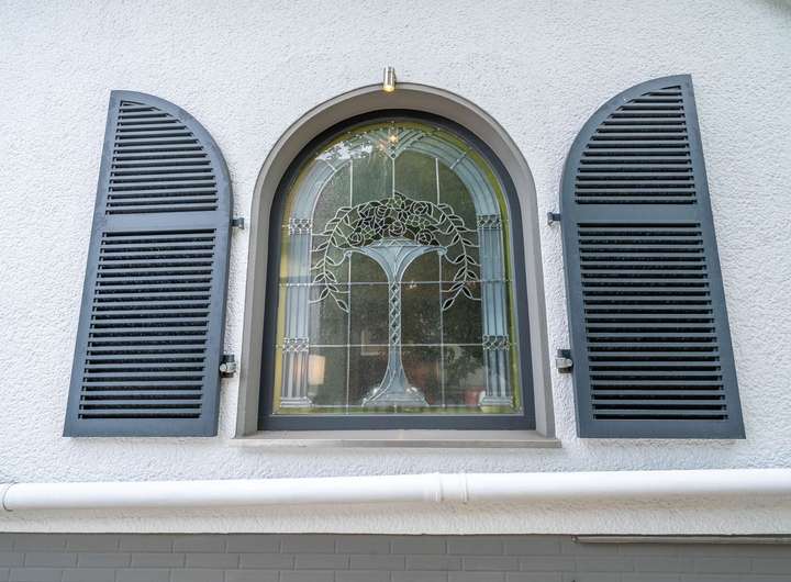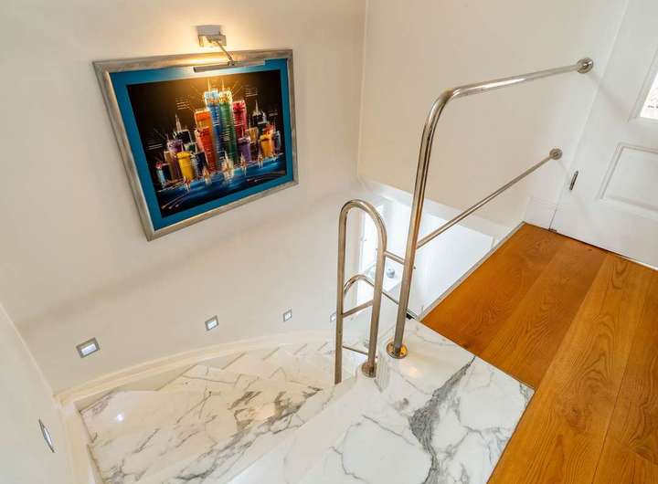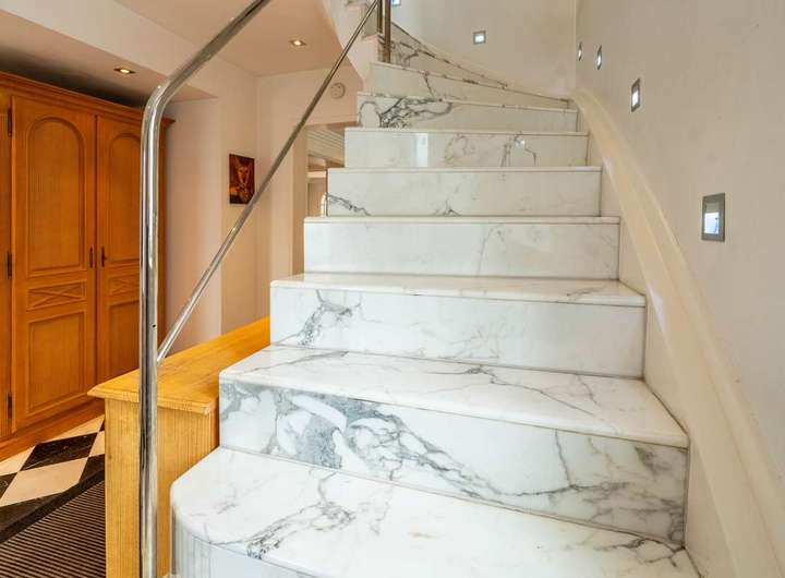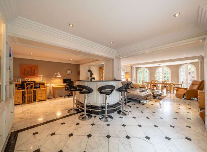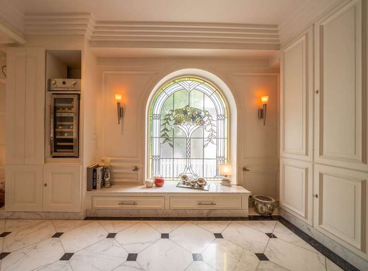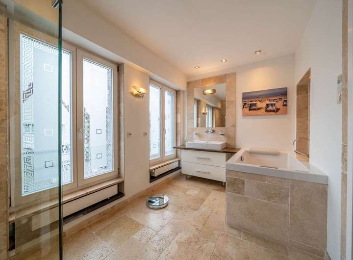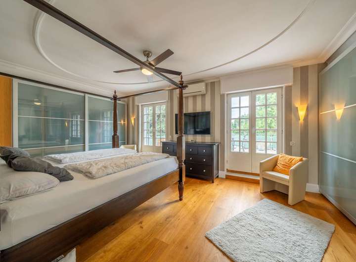 Besondere Stilelemente wie Marmorböden, teils in Schachbrettoptik, Holz-Sprossenfenster, Fenster mit Glaskunst sowie verschließbare Fensterläden prägen den unverwechselbaren Charakter. Ergänzt wird dies durch Echtholzparkett im Dachgeschoss, weitere Marmordetails im Innenbereich und eine große Terrasse im Garten mit Travertinsteinen.