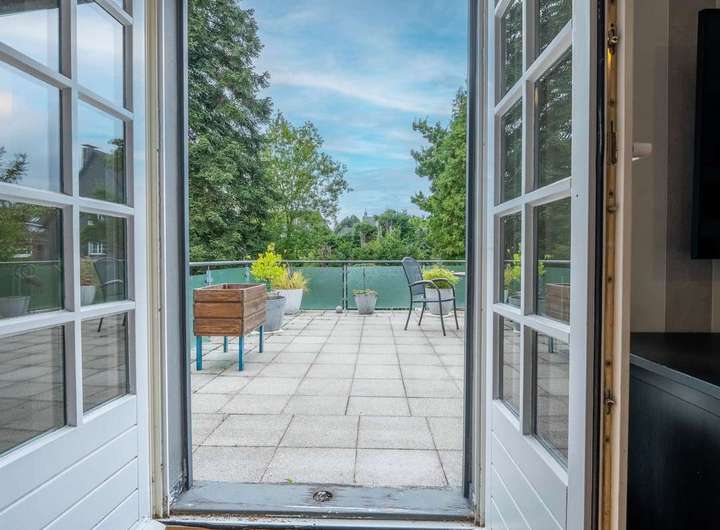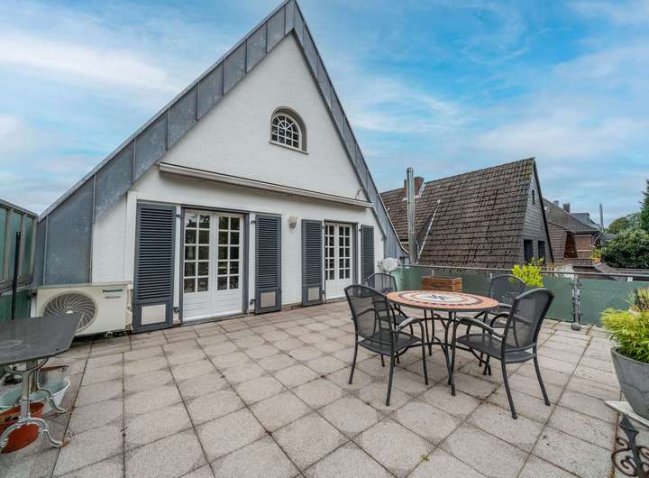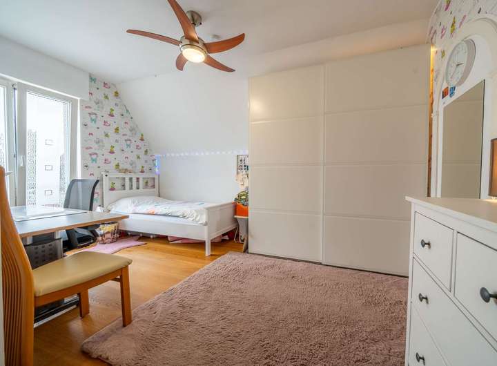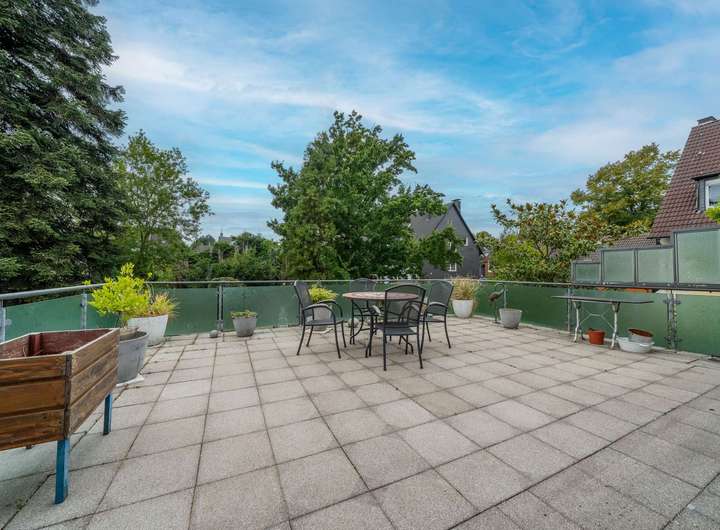 Im Dachgeschoss überzeugt das große Schlafzimmer mit direktem Zugang zur rund 50 m² großen Dachterrasse - ein echtes Highlight mit viel Platz zum Entspannen. Zusätzlich stehen ein Kinderzimmer sowie ein Badezimmer mit Dusche und Sitzbadewanne zur Verfügung.