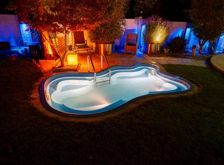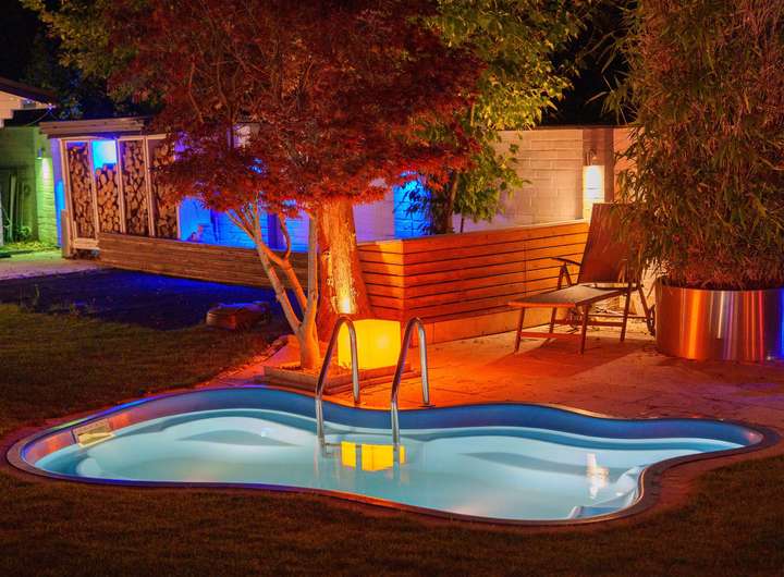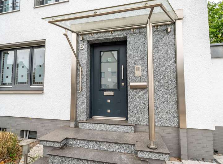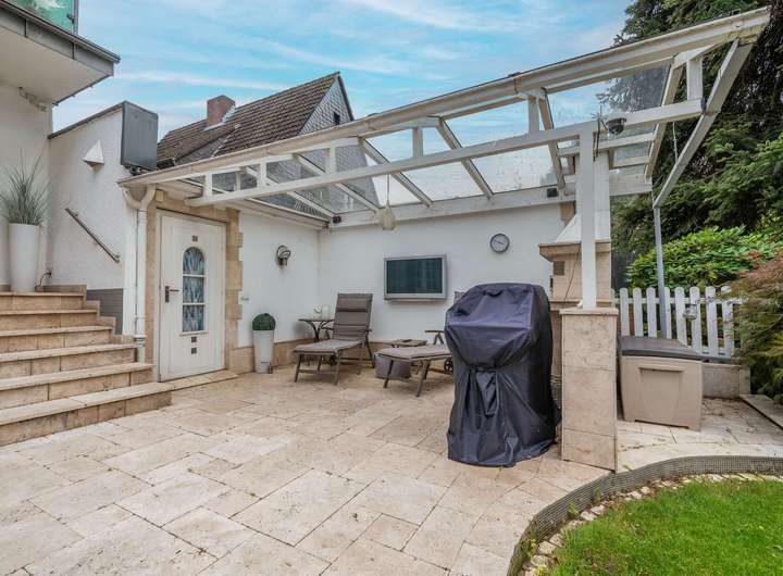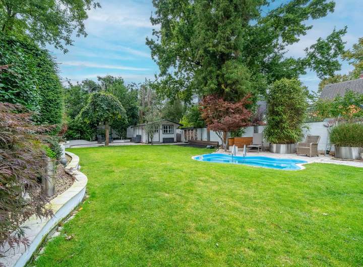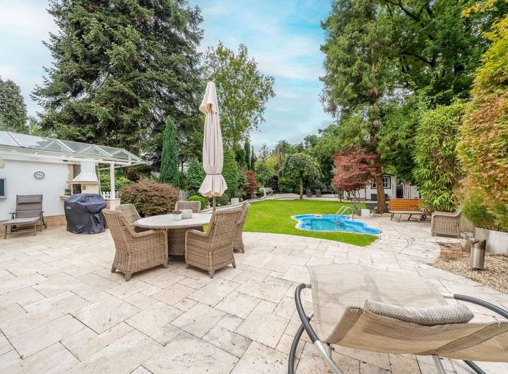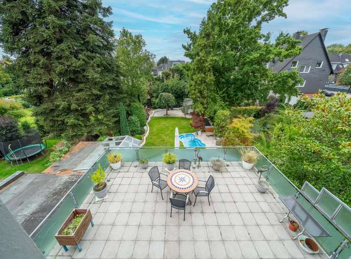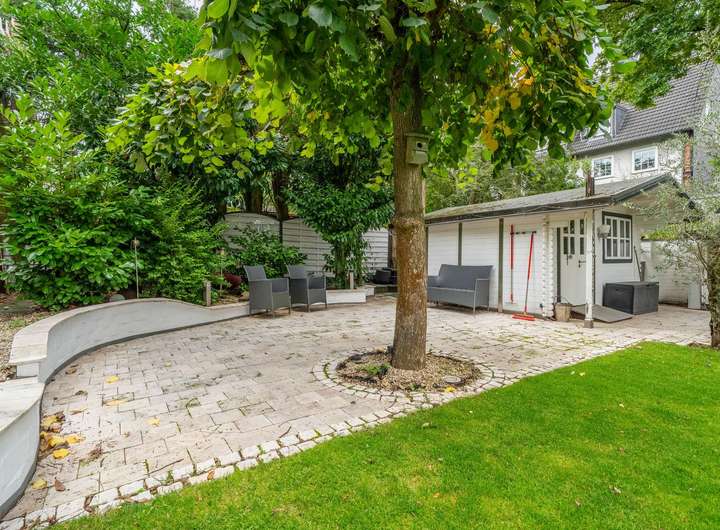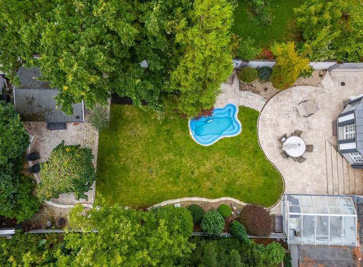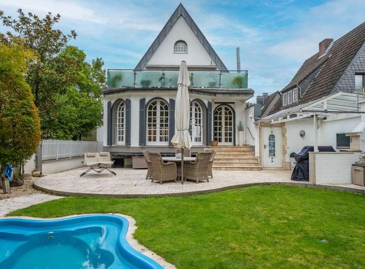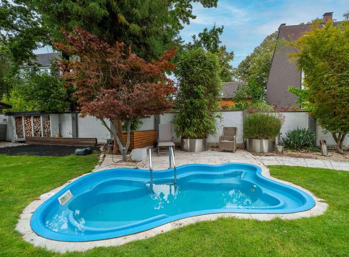 Im Erdgeschoss befindet sich ein großzügiger Wohn- und Essbereich mit Granittheke und Hark-Kamin. Die hochwertige Küche mit Markengeräten lässt sich über eine Schiebetür abtrennen. Von dort aus führt der Zugang in den aufwendig angelegten Garten: üppige Bepflanzung, weitläufige Terrassenflächen, ein Holz-Gartenhaus, ein hochwertiger GFK-Pool und eine für die Lage beeindruckende Privatsphäre machen ihn zu einem besonderen Rückzugsort.