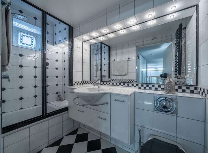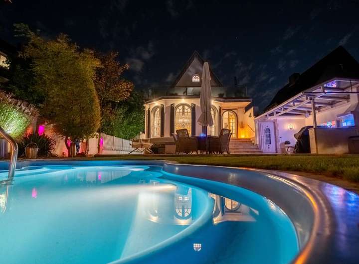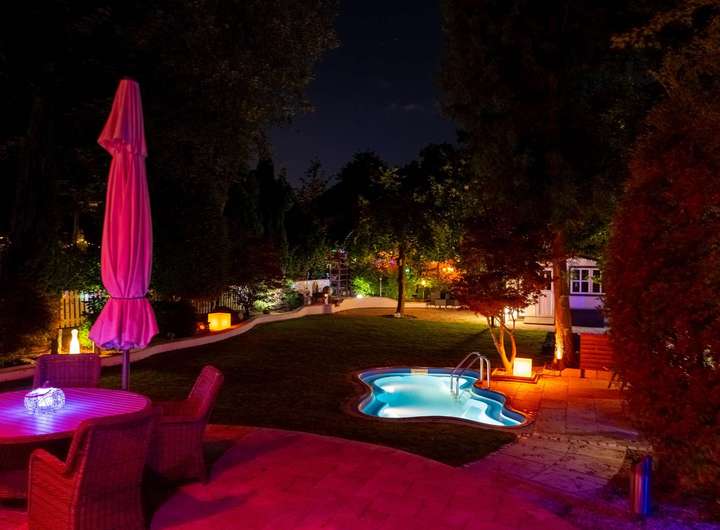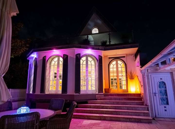 Neben den klassischen Gestaltungselementen überzeugt das Haus mit moderner Technik: elektrische Rollläden, Fußbodenheizung, Fernwärme, eine Klimaanlage im Schlafbereich sowie zahlreiche LED-Einbaustrahler schaffen hohen Wohnwert. Eine aufwendig installierte Gartenbeleuchtung setzt die Außenflächen eindrucksvoll in Szene und sorgt für eine besondere Atmosphäre in den Abendstunden.