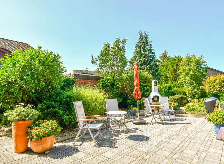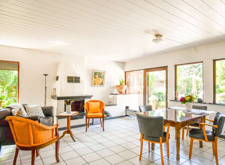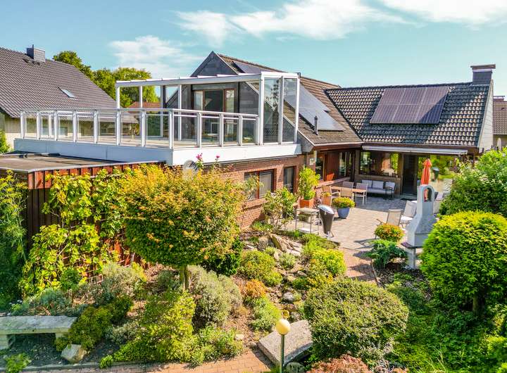 Das Erdgeschoss präsentiert sich hell und einladend: Große Fensterflächen lassen viel Tageslicht herein und ermöglichen zugleich mehrere Zugänge zur weitläufigen Terrasse und in den gepflegten Garten. Mittelpunkt ist der offene Wohn- Ess- und Loungebereich mit Kamin. Das 2017 modernisierte Tageslichtbad mit bodengleicher Dusche und großzügiger Eckbadewanne präsentiert sich zeitgemäß. Ein Schlafzimmer mit Ankleide, eine Einbauküche, ein Gästezimmer und Gäste-WC sowie eine praktische Hobbyküche runden das Raumangebot ab. Für behagliche Wärme sorgt die Flüssiggasheizung aus dem Jahr 2017. Zusätzlich punktet die Immobilie mit einer Photovoltaikanlage (5,886 kWp) sowie einer Wallbox für Elektrofahrzeuge nebst Außenstellplätzen.