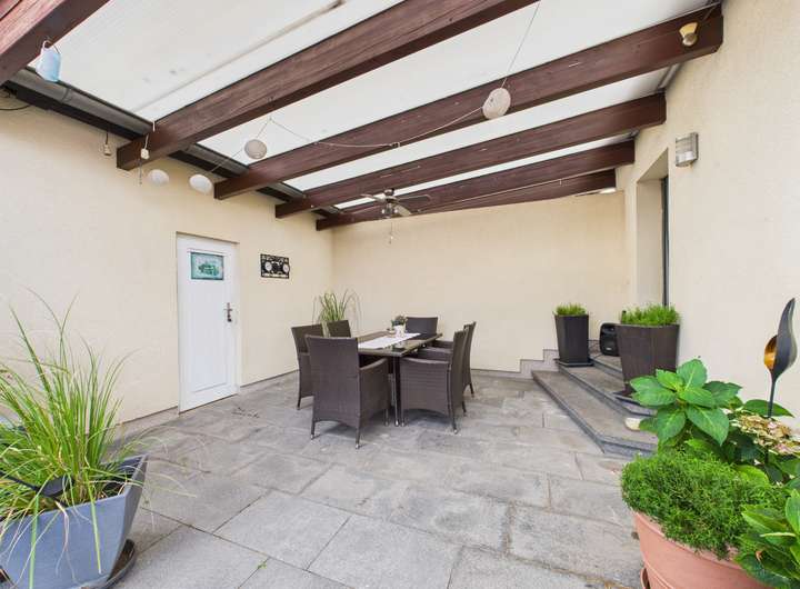 Die Wohnfläche verteilt sich auf 5 Zimmer, davon 3 Schlafzimmer, die sich flexibel nutzen lassen – ob als Kinderzimmer, Gästezimmer oder Homeoffice. Der große, offene Wohnbereich mit Zugang zur überdachten Terrasse schafft ein helles, freundliches Ambiente und lädt zum Entspannen und Genießen ein.