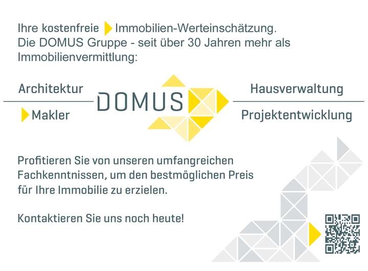 Die Courtage in Höhe von 3,57 % inklusive der gesetzlichen Mehrwertsteuer auf den Kaufpreis ist mit dem Zustandekommen des Kaufvertrages (notarieller Vertragsabschluss) verdient und fällig. Käufer und Verkäufer schulden die Courtage aufgrund separater Vereinbarungen in Textform in gleicher Höhe. Die Domus GmbH erhält einen unmittelbaren Zahlungsanspruch gegenüber dem Käufer und dem Verkäufer. Mit dieser Offerte bieten wir Ihnen unsere Dienste als Makler an. Bei aller Sorgfalt können wir keine Gewähr dafür übernehmen, dass alle Angebotsangaben des Grundeigentümers und/oder des Vermieters oder Vormieters richtig sind und die Immobilie oder das Grundstück im Augenblick des Zuganges der Offerte noch verfügbar ist. Irrtümer, Änderungen und Zwischenverkauf bleiben vorbehalten. Angaben, Abbildungen und zeichnerische Darstellungen sind unverbindlich in Bezug auf den Kaufgegenstand. Die ggf. Dargestellte Möbel und Einbauten bei Einer Immobilie sind beispielhaft und im Kaufgegenstand nicht enthalten, soweit in den notariellen Kaufunterlagen nicht anders angegeben. Die Grundrisse einer Immobilie sind zur Maßentnahme für Möblierungen/Einbauten nicht geeignet. Zusicherungen baulicher und planerischer Beschaffenheiten und/oder baurechtliche Nutzungsmöglichkeiten werden ausdrücklich nicht übernommen, ebenso dienen die Visualisierungen lediglich der Orientierung und können Abweichungen enthalten. Ausschließlich die Angaben im notariellen Kaufvertrag sind ausschlaggebend. soweit in den notariellen Kaufunterlagen nicht anders angegeben. Die Grundrisse einer Immobilie sind zur Maßentnahme für Möblierungen/Einbauten nicht geeignet. Zusicherungen baulicher und planerischer Beschaffenheiten und/oder baurechtliche Nutzungsmöglichkeiten werden ausdrücklich nicht übernommen, ebenso dienen die Visualisierungen lediglich der Orientierung und können Abweichungen enthalten. Ausschließlich die Angaben im notariellen Kaufvertrag sind ausschlaggebend. soweit in den notariellen Kaufunterlagen nicht anders angegeben. Die Grundrisse einer Immobilie sind zur Maßentnahme für Möblierungen/Einbauten nicht geeignet. Zusicherungen baulicher und planerischer Beschaffenheiten und/oder baurechtliche Nutzungsmöglichkeiten werden ausdrücklich nicht übernommen, ebenso dienen die Visualisierungen lediglich der Orientierung und können Abweichungen enthalten. Ausschließlich die Angaben im notariellen Kaufvertrag sind ausschlaggebend.