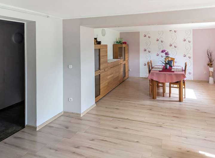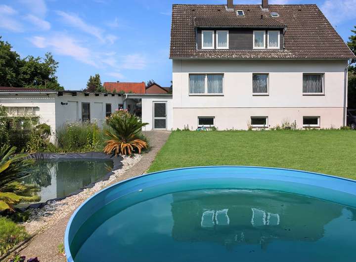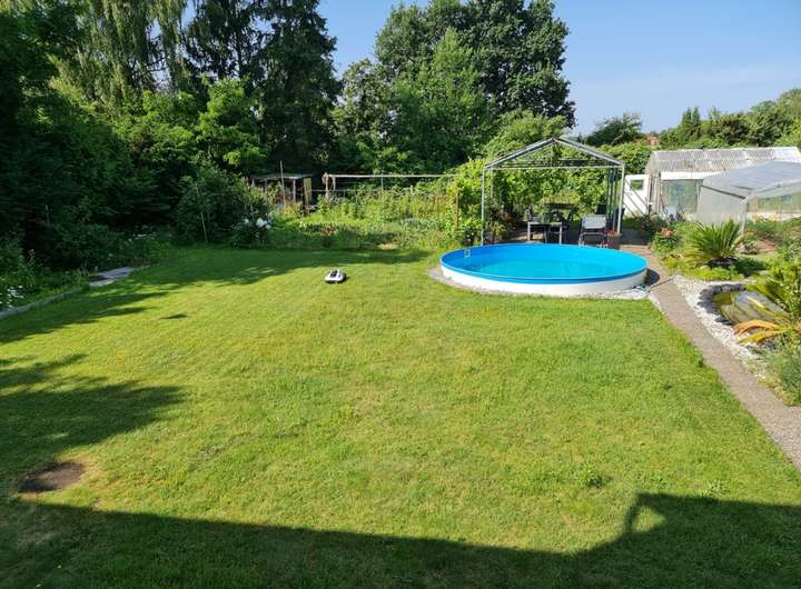 Liebe Gartenfreunde, Ruhesucher, Landliebhaber - hier ist Ihr Gamechanger! Auf einem ca. 1053 m² großen Grundstück in Feldrandlage steht Ihr neues Zuhause mit ca. 155 m² Wohnfläche und einem Keller, in dem Sie zusätzlich wohnwerter Raum von ca. 38 m² mit einer modernen Einbauküche, Dusche und einem riesigen Zimmer erwartet, ideal als erstes Apartment für die fast erwachsenen Kinder oder zum Feiern. Auf Abstellmöglichkeiten müssen Sie deshalb nicht verzichten. Diese gibt es nicht nur im Keller, auch im Gerätehaus im Garten bzw. in der Garage. Ursprünglich als 2-Familienhaus mit je drei Zimmern, Küche und Bad gebaut, lebt hier heute eine Familie sehr großzügig. Wie möchten Sie wohnen? Sie brauchen viel Platz für sich und Ihre Kinder? Oma und Opa sollen mit oder Sie möchten wohnen und arbeiten unter einem Dach? Ein Mieter soll beim Abtrag des Hauses helfen? All das ist kein Problem. Die Immobilie ist im gepflegten Zustand, das Bad im Erdgeschoss neuwertig. Hier können Sie ohne großen finanziellen Aufwand, nach kleinen Renovierungsarbeiten einziehen. Geheizt wird die Immobilie über kostengünstige Fernwärme. Auf etwas Zuwendung wartet der große Garten. Ein Pool für heiße Sommertage ist schon da, ebenso Teich, Nutz-, und Ziergarten, Gewächshaus und Spielwiese. Mit Kennerblick und grünem Daumen schaffen Sie sich Ihr eigenes Paradies, werden vielleicht sogar zum Selbstversorger. Also "RAUS AUFS LAND" - belohnt werden Sie mit ganz viel Freiheit, frischer Luft und bezahlbarem Wohnraum!