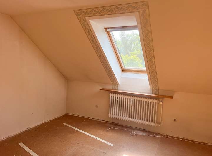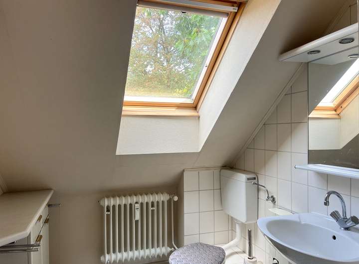 Das Dachgeschoss erreichen Sie direkt über das zentrale Treppenhaus, für dies auch ein Sondernutzungsrecht besteht. Vom Flur gehen die beiden Schlafzimmer, sowie das weiß geflieste Bad mit Dusche ab. Alle dieser Zimmer sind mit Velux-Fenstern ausgestattet.