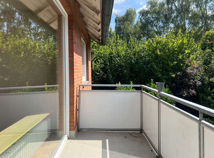 Im Obergeschoss befinden sich das geräumige Wohnzimmer, zwei Schlafzimmer, die Küche, Flur mit Abstellraum und Garderobe sowie ein Bad mit Wanne. Vom Wohnzimmer gelangen Sie auf den sonnigen Süd-Balkon mit einem herrlichen Blick ins Grüne.