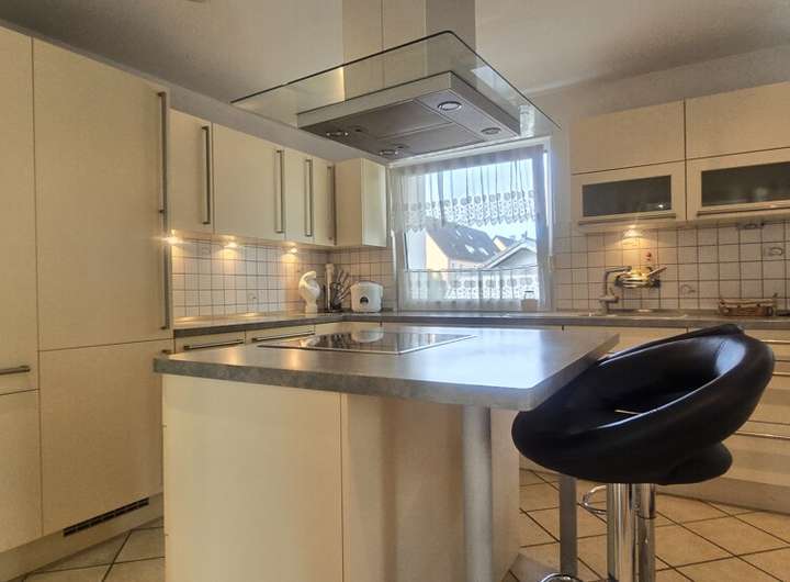 Die andere Haushälfte besticht durch eine gut erhaltene, stilvoll alte Küche mit Kücheninsel – ein attraktives Highlight, das Charakter und Charme zeigt.