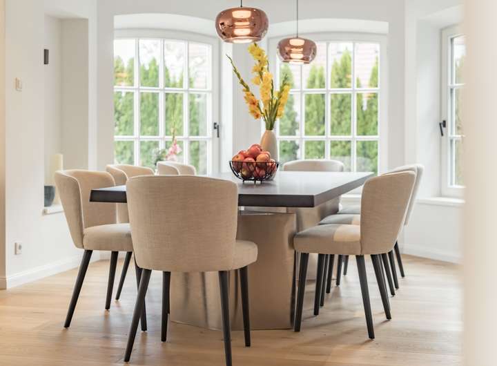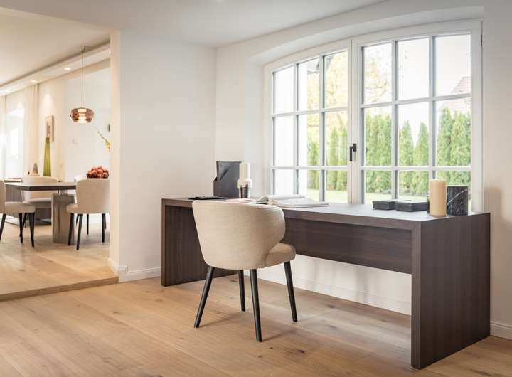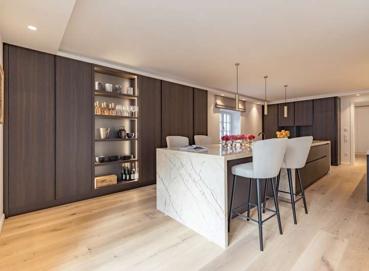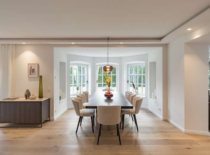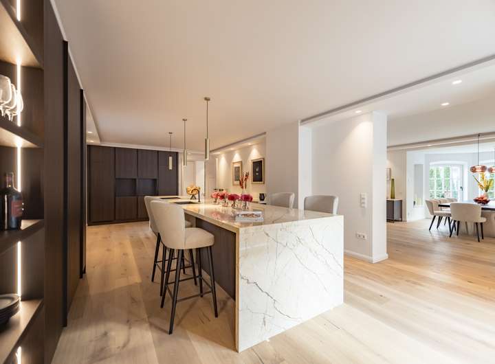 Ein großzügiges und repräsentatives Wohnzimmer, eine große Küche mit Bar befinden sich im Erdgeschoss.