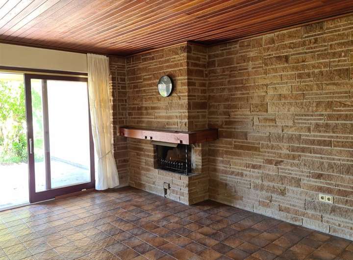 Wohn-Esszimmer mit offenem Kamin und Zugang zur teilweise überdachten Terrasse