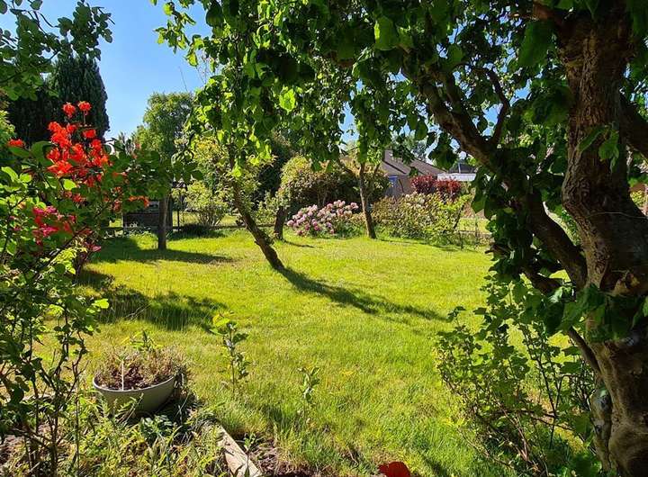 Das ca. 762 m² große Grundstück ist mit einem umfangreichen Pflanzenbestand versehen und südwestlich ausgerichtet.
