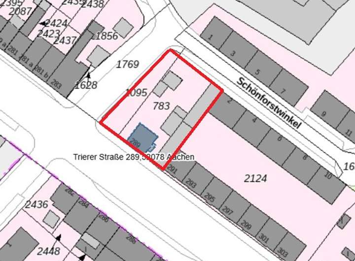 Es handelt sich um ein Kopfgrundstück einer Blockrandbebauung mit nord-westlicher Ausrichtung, das sich unweit der Innenstadtlage befindet. Das Grundstück grenzt unmittelbar an die Trierer Straße, der Schönforststraße sowie der Straße Schönforstwinkel. Das Grundstück ist im Wesentlichen mit einem solitär errichteten Gebäudeköper (Wohnhaus) in Massivbauweise bebaut. Rechts neben dem Hochbaukörper befindet sich ein weiterer Flachbau, angrenzend an die Nachbarbebauung, der sich von der Trierer Straße bis an die Straße Schönforstwinkel erstreckt und der offensichtlich als Lager- und Abstellfläche diente. Weitere kleinere bzw. unfertige flach-geschossige Baukörper befinden sich auf dem Grundstück.