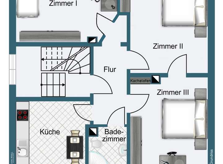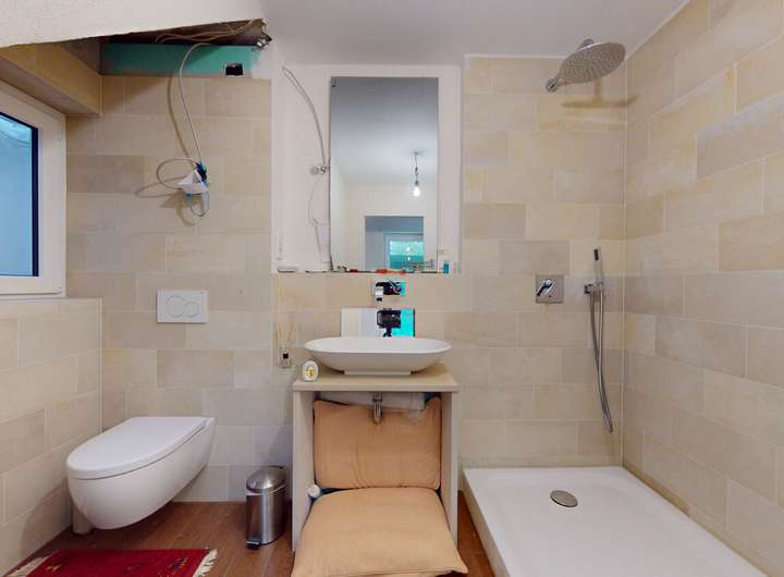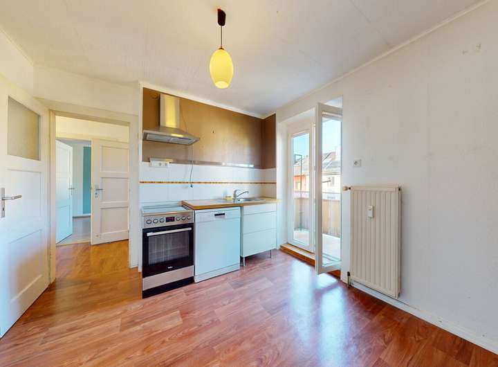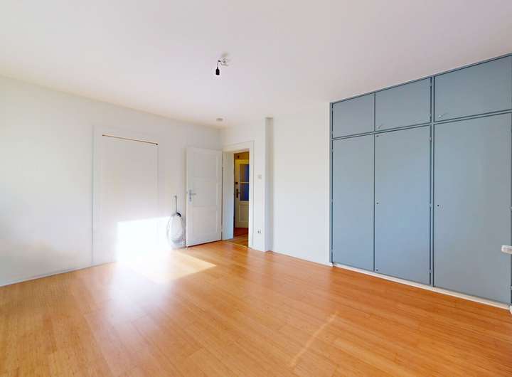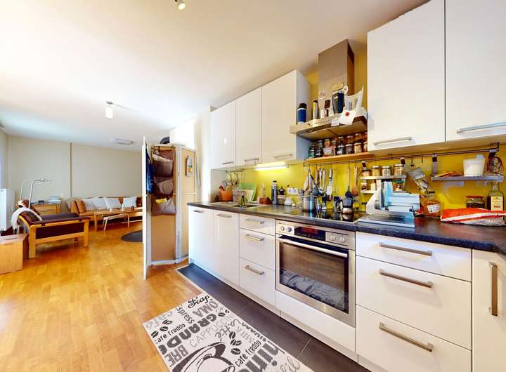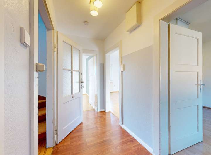 Die Wohnung im Erdgeschoss wurde 2012 renoviert und durch einen Anbau erweitert. Auf circa 100 m² Wohnfläche befinden sich drei Schlafzimmer, ein Wohn-/ Esszimmer mit offener Küche und Balkon sowie zwei Duschbäder mit Fenster.
