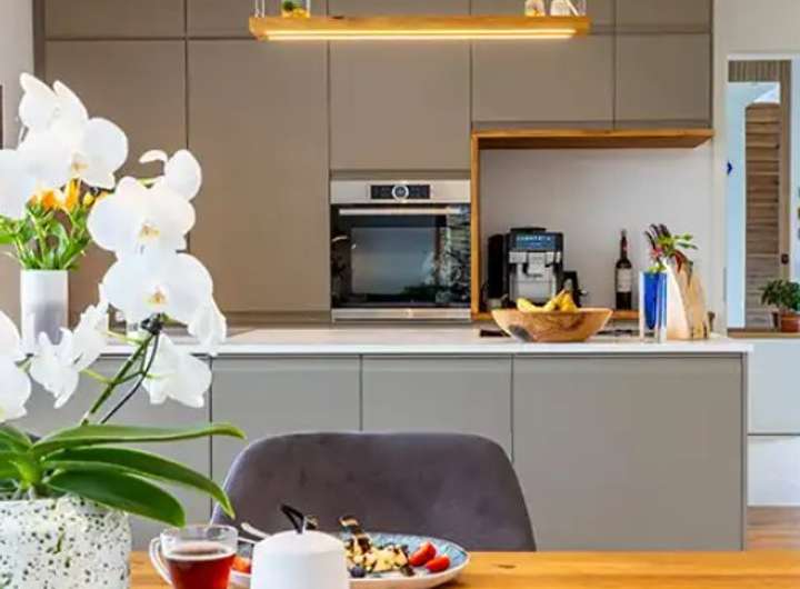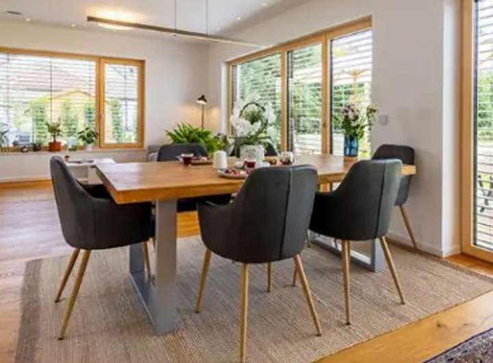 Im Erdgeschoss erwartet Sie ein großzügiger Wohnbereich mit eleganten Böden, bodentiefen Fenstern, die viel Tageslicht hereinlassen und einen herrlichen Blick auf Ihren Garten und die Natur bieten. Ein geräumiges Esszimmer lädt zu geselligen Abenden ein.