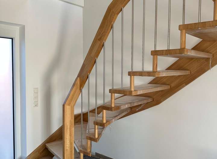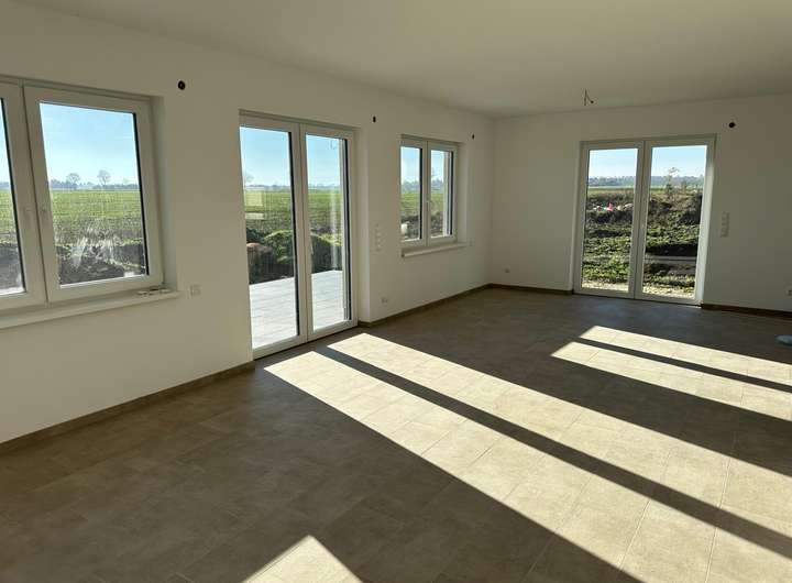 Im Erdgeschoss erwartet Sie ein offener Wohn- und Essbereich mit hochwertiger Einbauküche sowie einem Gäste-WC und einem geräumigen Hauswirtschaftsraum. Als Fußbodenbelag findet sich eine moderne, helle Fliese. Vom Wohnbereich haben Sie einen wunderschönen Weitblick zum Elm und Harz.