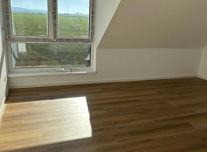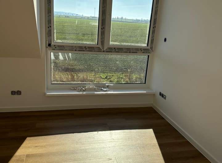 Im Obergeschoss befinden sich 2 Kinderzimmer/Arbeitszimmer, ebenfalls mit wunderbarem Weitblick sowie ein Schlafzimmer mit angenehmer Größe. In den Wohnräumen sorgt ein moderner Vinylboden für eine gemütliche Atmosphäre. Das Bad ist modern gestaltet mit Badewanne und ebenerdiger Dusche. Das Haus verfügt über eine Fußbodenheizung, beheizt über eine Wärmepumpe sowie über elektrische Außenjalousien.