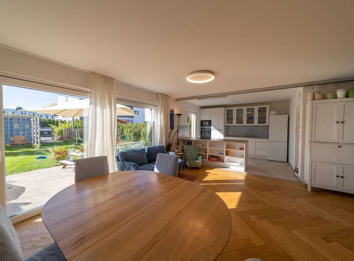 Sie betreten das Haus durch die elektrisch öffnende Haustür mit Fernbedienung. Im Erdgeschoss empfängt Sie ein großzügiger Eingangsbereich mit Gäste-WC und Haustechnikraum. Von hier führt der Weg in den offenen Wohn- und Essbereich, der mit Echtholz-Fischgrätparkett ausgestattet ist. Die offene Küche bietet eine praktische Abstellnische. Über die große Fensterfront des Wohnzimmers gelangt man direkt auf die Terrasse und in den Garten. Dieser ist nach Südosten ausgerichtet, bietet viel Platz für Spielen, Entspannen oder gesellige Runden und verfügt über zwei Gartenschuppen sowie ein Gartentor auf der Rückseite. Ein weiteres Zimmer im Erdgeschoss, aktuell als Musik- und Fernsehzimmer genutzt, lässt sich durch eine Schiebetür bei Bedarf vom Wohnraum trennen.
