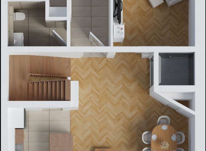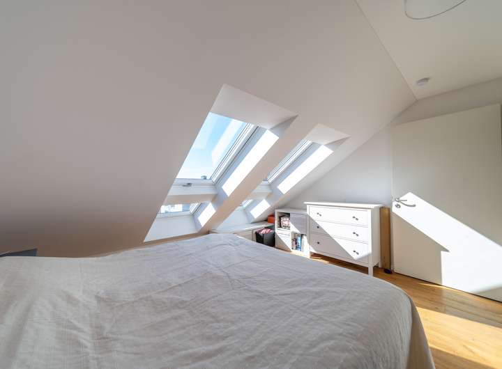 Im Dachgeschoss befinden sich drei weitere Zimmer sowie ein Bad mit ebenerdig gefliester Dusche und Anschlüssen für Waschmaschine und Trockner. Die Schlafzimmer verfügen über verlängerte Dachfenster, die auch hier viel Tageslicht in die Räume bringen. Der offene Flurbereich bietet zusätzlichen Platz für individuelle Nutzung – aktuell als Sportfläche gestaltet. Auch im Dachgeschoss wurde Landhausdielenparkett in Eiche verlegt.