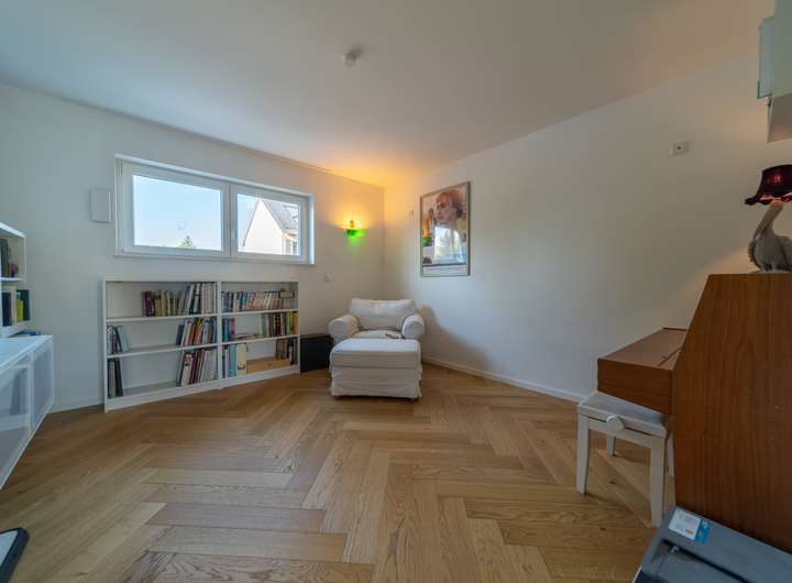 Auch technisch ist das Haus ideal für die Zukunft ausgestattet: Alle Räume verfügen über CAT-Netzwerkverkabelung, die im Haustechnikraum zusammenlaufen. Elektrische Rollläden sorgen für Komfort – sogar im Dachgeschoss -, im Erdgeschoss zur Gartenseite wurden Raffstores verbaut. Die Heizungsversorgung erfolgt über eine Erdwärmepumpe und liefert über die Fußbodenheizung im Winter angenehme Wärme und sorgt im Sommer für kühlere Temperaturen. Die Wärmedämmfenster sind 3-fach verglast und das Haus verfügt über eine dezentrale Lüftungsanlage der Firma Airfox. Der Endenergiebedarf liegt bei A+. Eine Photovoltaikanlage auf beiden Dachseiten erzielte im Jahr 2024 einen Ertrag von rund 11.000 kWh – genug, um Wärmepumpen- und Haushaltsstrom abzudecken und zusätzlich eine Einspeisevergütung zu erzielen (verbrauchsabhängig).