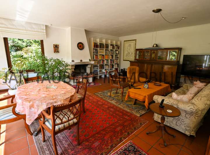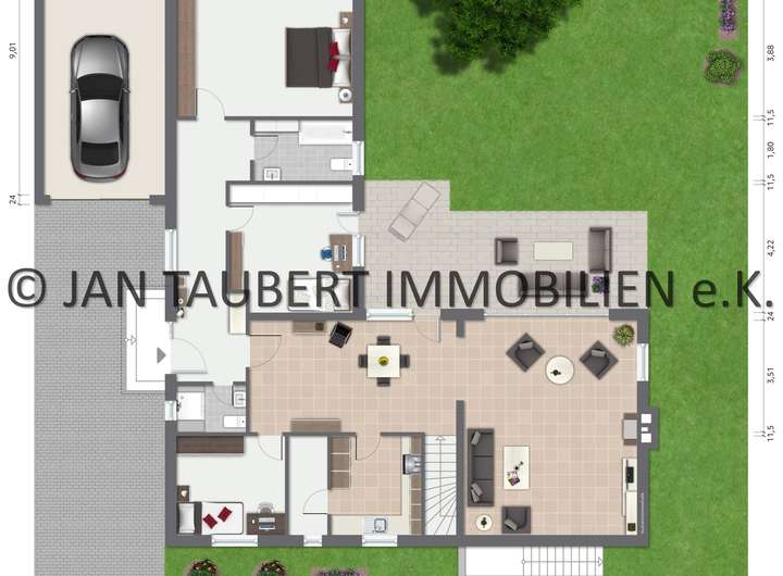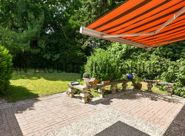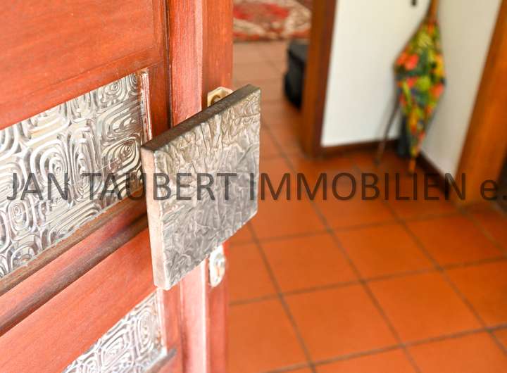 Erdgeschoss: 	heller Wohnbereich mit Kamin, Essbereich direkt vor der Küche – Tür zur Terrasse, Küche mit Einbauzeile, praktischer Vorratsraum, Diele mit Platz für Garderobe, Gäste-WC mit Dusche/Fenster, Bodenbeläge Fliese oder Teppichboden (Schlafräume), große Terrasse in L-Form mit Markisen