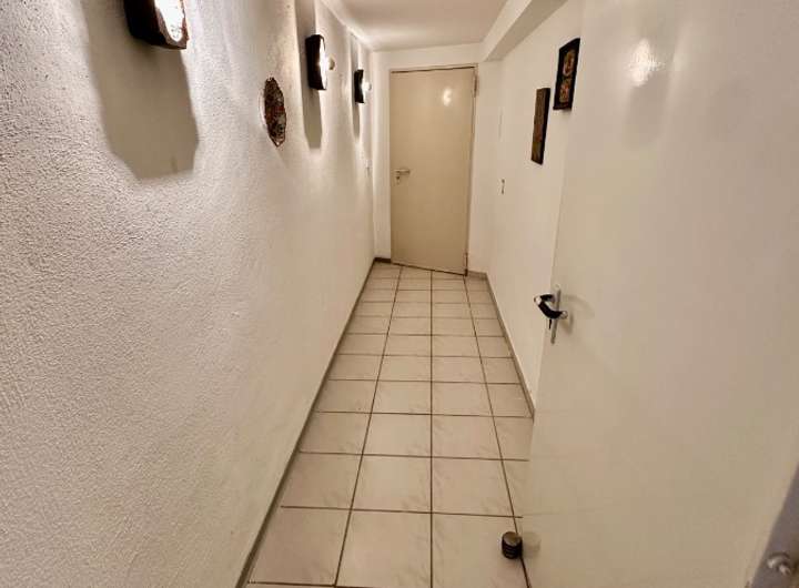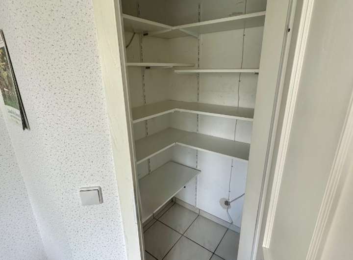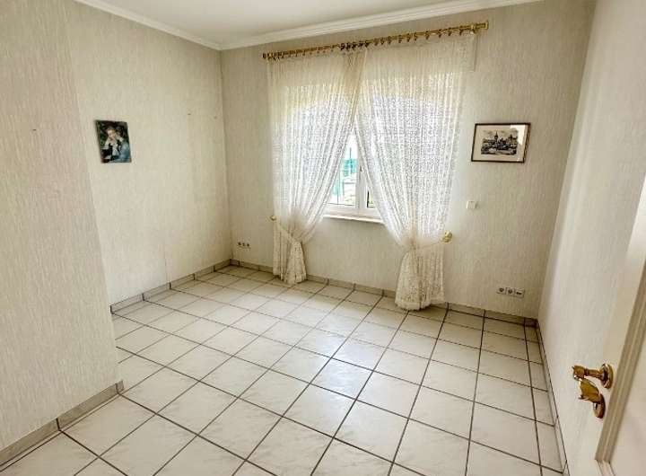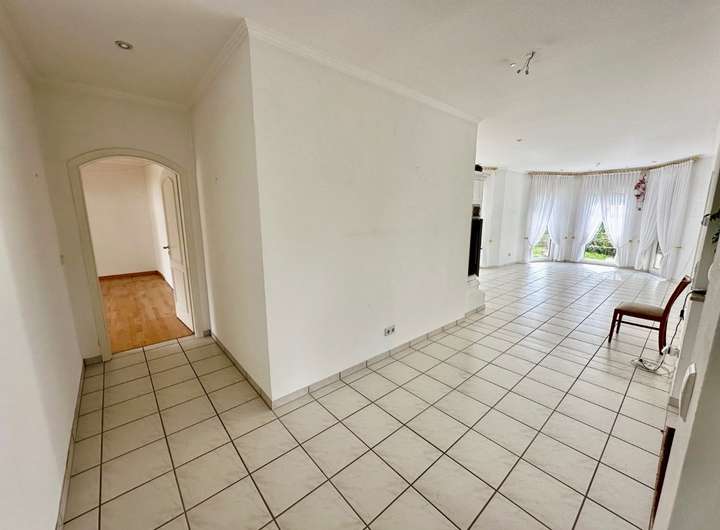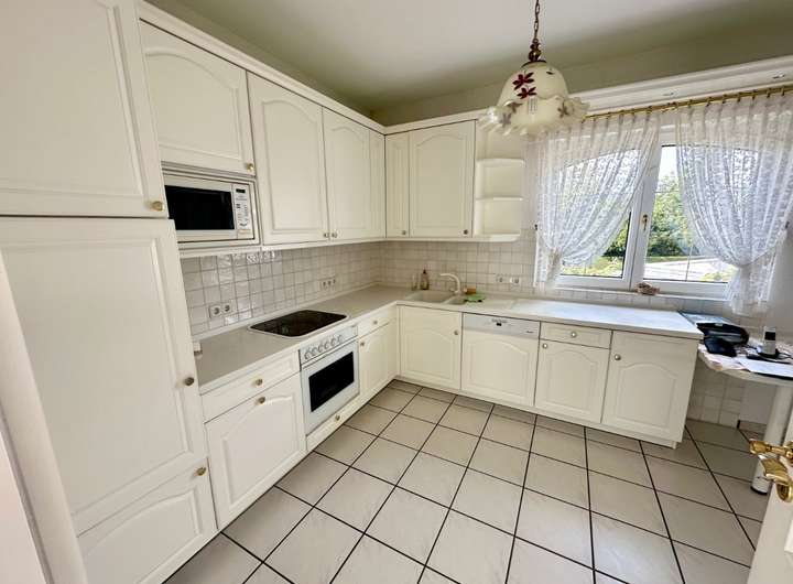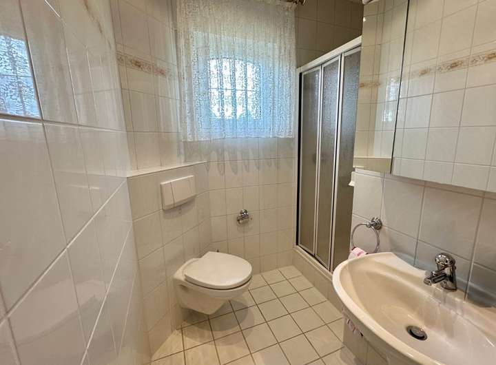 Die angrenzende, geräumige Küche mit praktischem Abstellraum bietet viel Platz für die Zubereitung gemeinsamer Mahlzeiten. Ein Gäste-Bad mit Dusche sowie ein flexibel nutzbares Zimmer – ideal als Büro, Gäste- oder Kinderzimmer – ergänzen diesen Bereich.