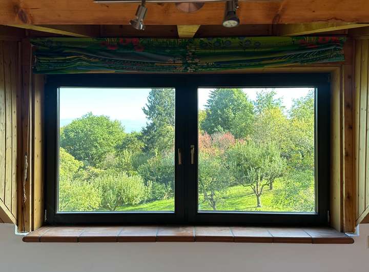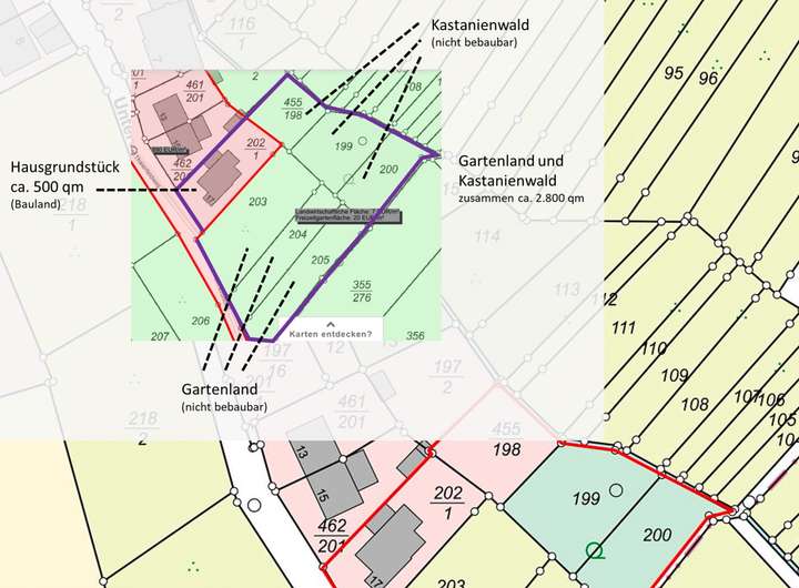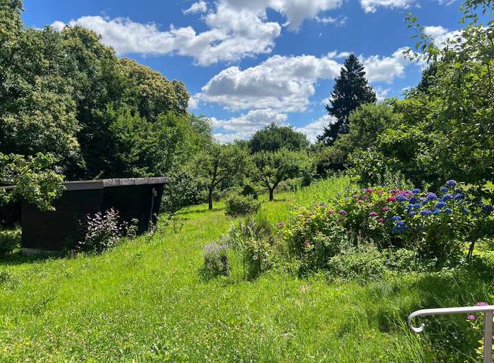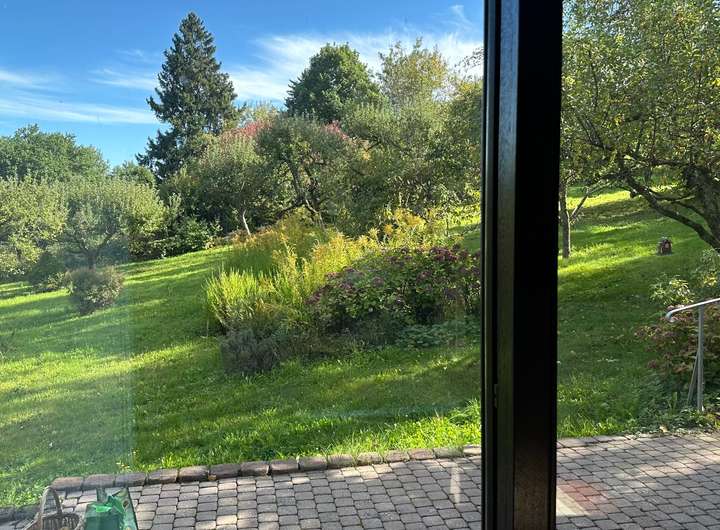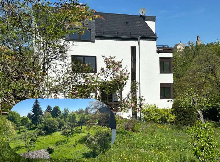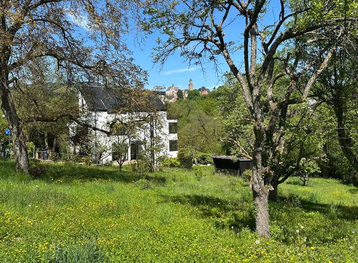 Das Haus steht auf einem Grundstück mit Garten, Wald und Burgblick: eine große Obstwiese und nach unten zum Bach hin ein Waldgrundstück mit 17 teilweise jahrhundertealten Esskastanien ergeben ein grünes Ensemble an der Bebauungsgrenze von Kronberg. Hier kann man in Ruhe wohnen und arbeiten.