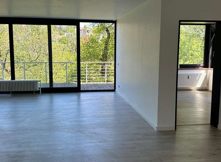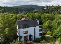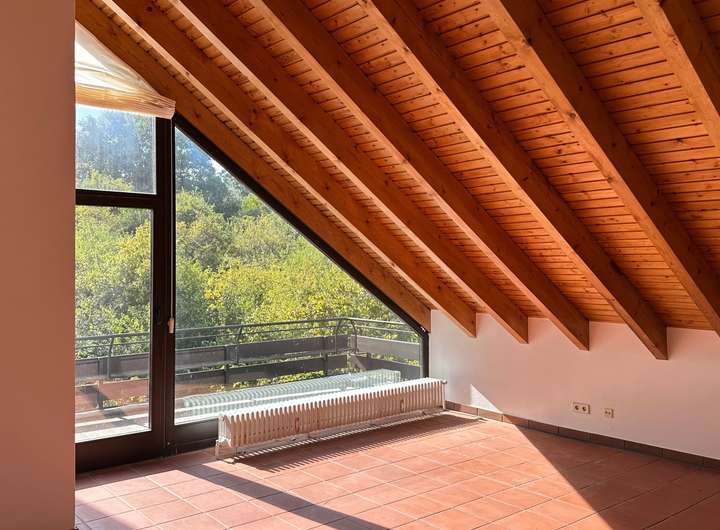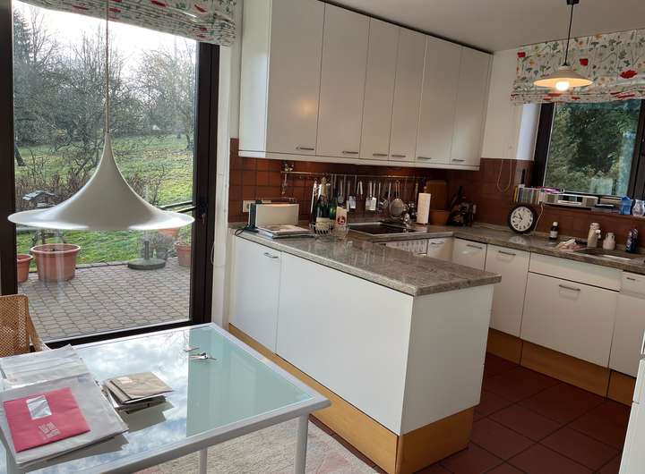Im Erdgeschoss führt die Küche direkt auf eine Sonnenterrasse mit angrenzendem Obstgarten. Das Haus verfügt außerdem über vier Balkone auf verschiedenen Seiten, zwei mit Blick auf die Kronberger Burg.