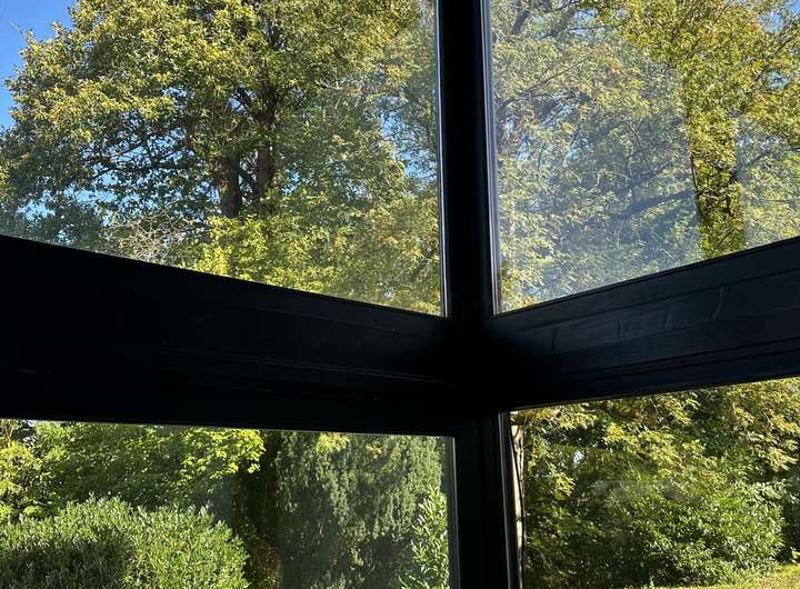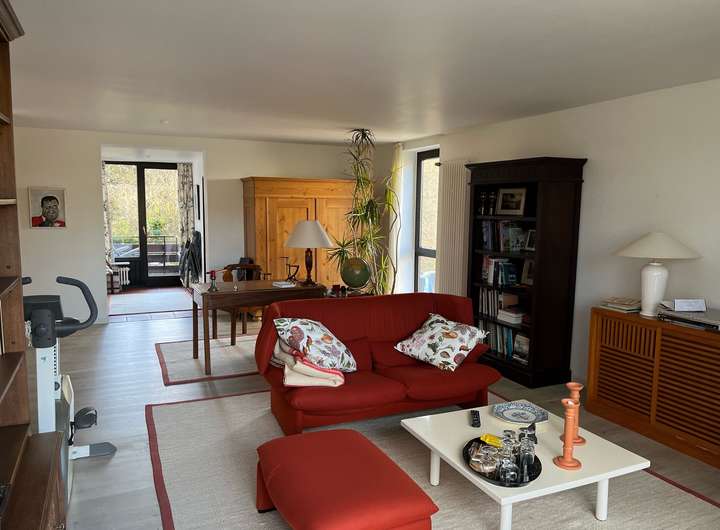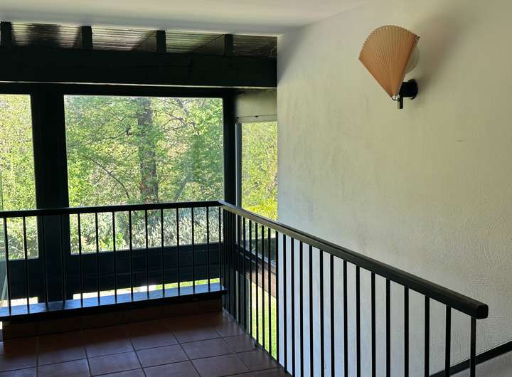 Das geräumige Wohnzimmer mit Kamin schließt mit einer Galerie zum großartigen Wintergarten ab, der über zwei Stockwerke reicht und mit vier enormen Glasfenstern den Blick auf den hinterm Haus gelegenen Kastanienwald öffnet. Über eine Treppe oder den Lift im Wintergarten gelangt man nach unten und zur Gartenterrasse direkt hinterm Haus.