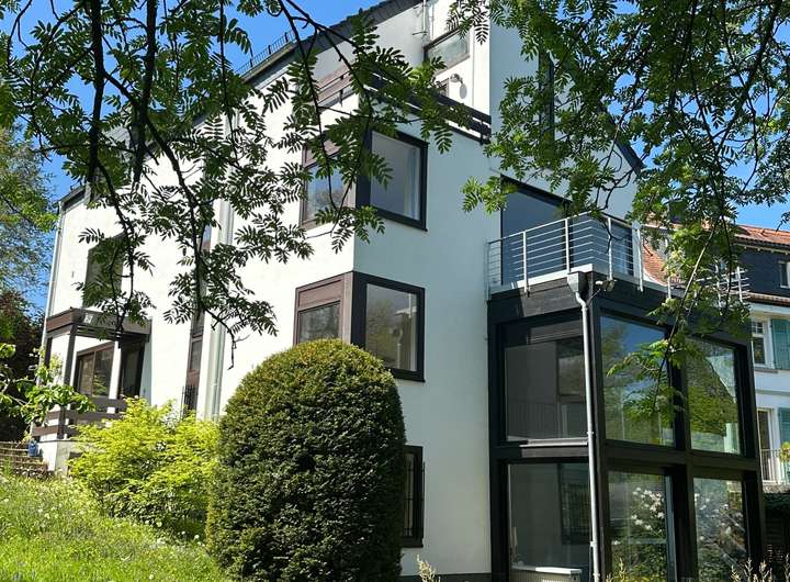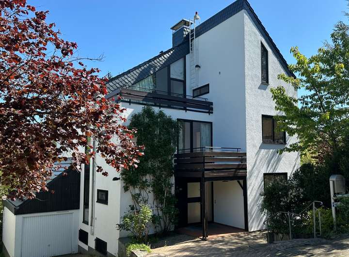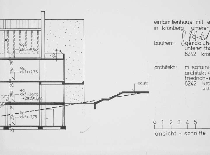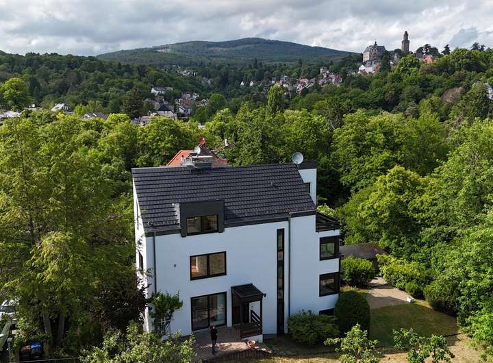 Das im Kronthal gelegene Haus ist 1979 vom iranischen Architekten Safainia entworfen worden: ein Designerhaus mit hellen Räumen, Blick ins Grüne und großzügiger Aufteilung, das auf vier Ebenen und über 3500 m² Grundstücksfläche viele Möglichkeiten für eine freie persönliche Ausgestaltung eröffnet.