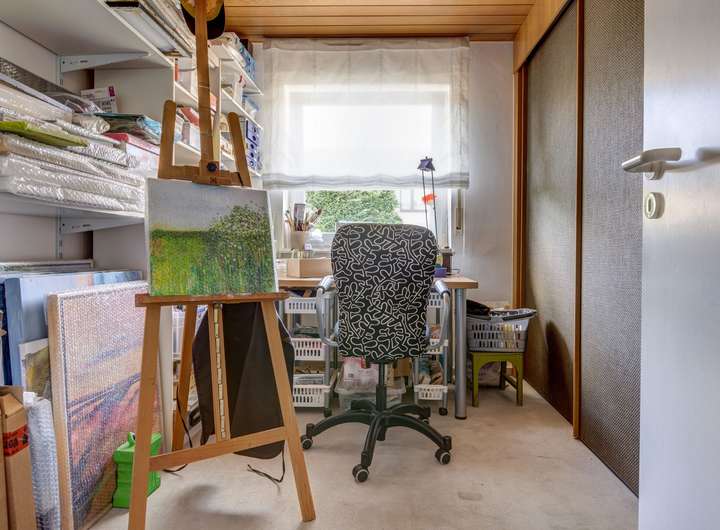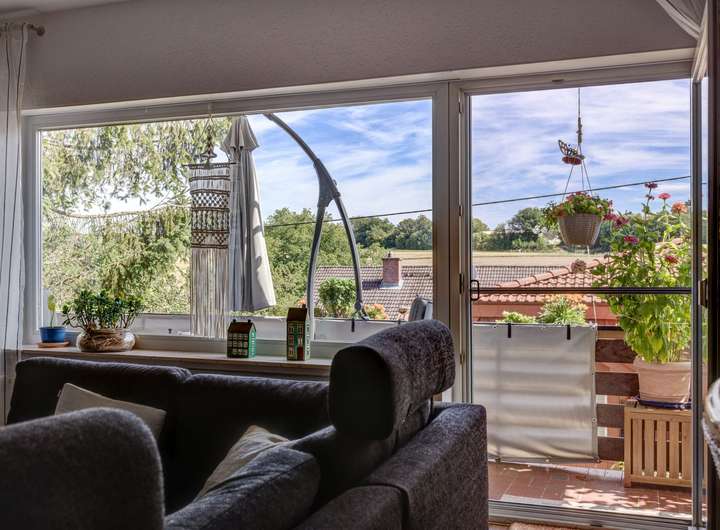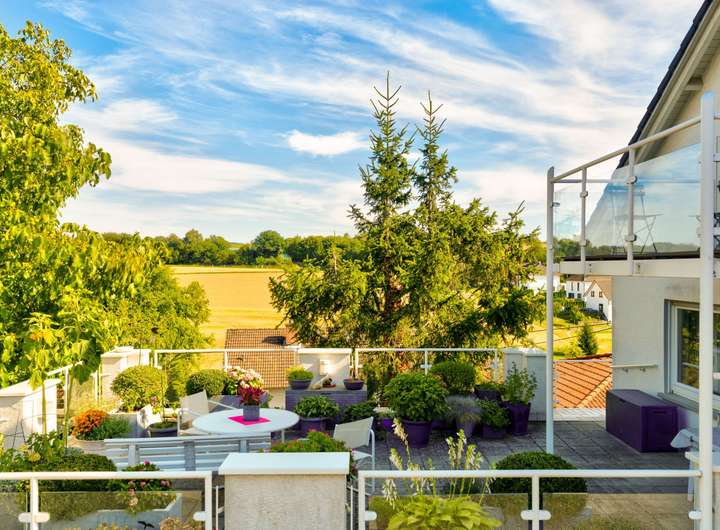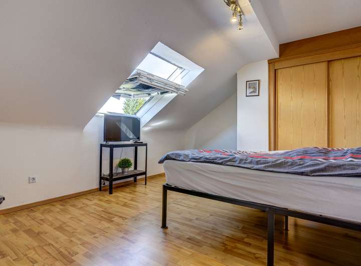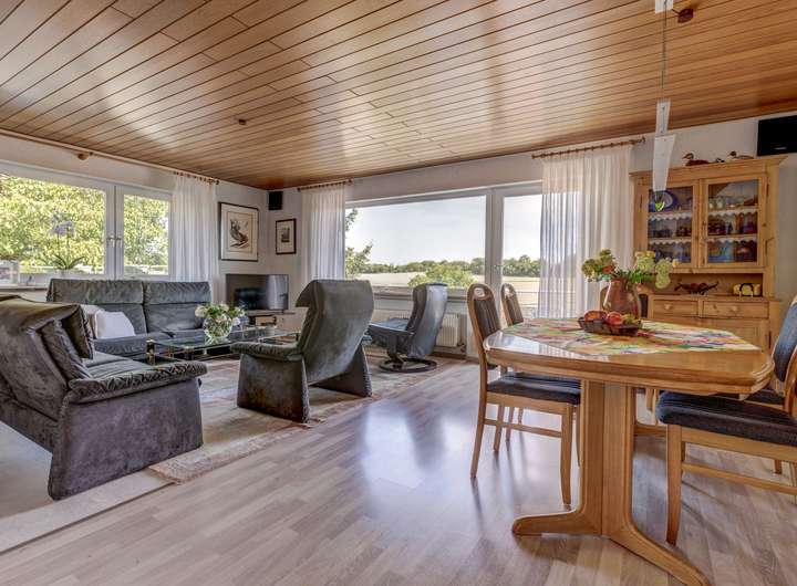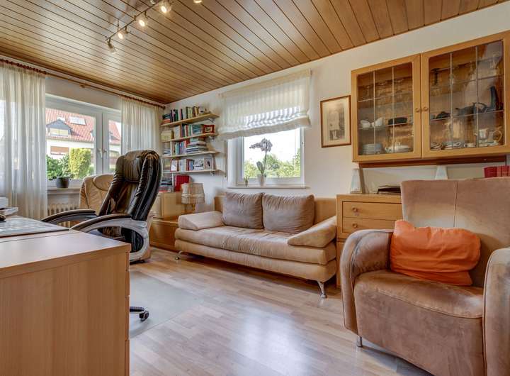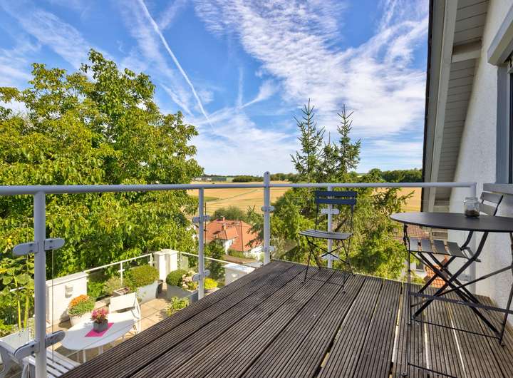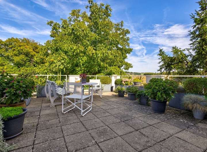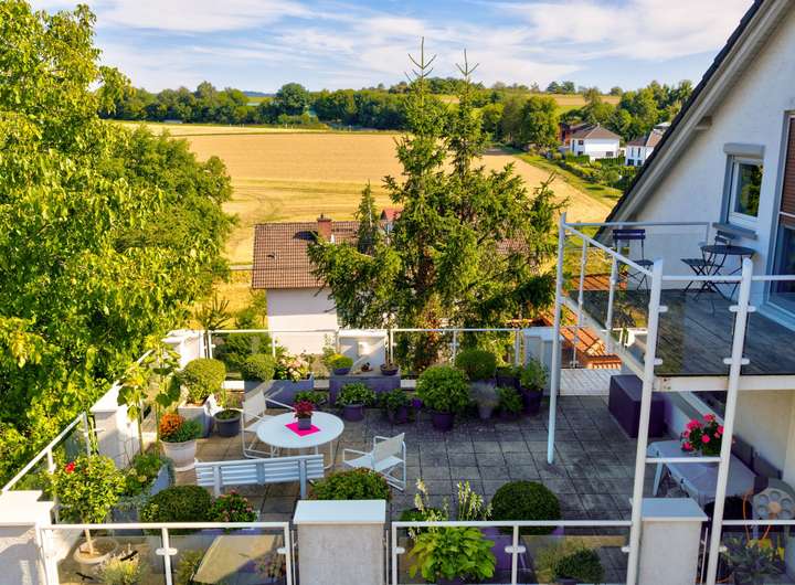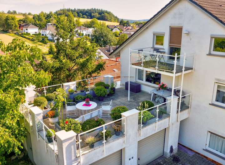 Obergeschoss (OG): helle 4-Zimmer-Wohnung (ca. 110 m²) inklusive Zugang zur großen, sonnigen Terrasse auf dem Garagendach.