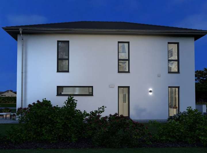 Mediterran-elegant präsentiert sich unsere Stadtvilla 13: Mit dem typischen Walmdach, der durch verschiedene Vorsprünge geprägten und dadurch angenehm aufgelockerten Fassade und den zahlreichen Fenstern und Glastüren ist sie ein ganz besonderer Blickfang. Und auch im Inneren besticht sie durch zahlreiche Vorzüge: Der offen gestaltete Koch-Ess-Wohnbereich im Erdgeschoss ist geräumig und lichtdurchflutet, was ihn zum idealen Treffpunkt für die ganze Familie macht. Ebenfalls auf dieser Ebene befinden sich ein knapp 13 m² großer Raum, der als Büro oder Gästezimmer genutzt werden kann, sowie ein Hauswirtschaftsraum, der raffiniert durch die ins Obergeschoss führende Treppe räumlich abgetrennt ist. In der ersten Etage haben sowohl Eltern als auch Kinder ihr eigenes, großzügiges Reich. Besonders klug gelöst: Im Elternbereich gehen Schlaf-, Ankleide- und Badezimmer ineinander über. Auch die beiden Kinderzimmer verfügen über ein gemeinsames Bad.