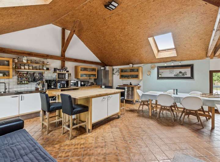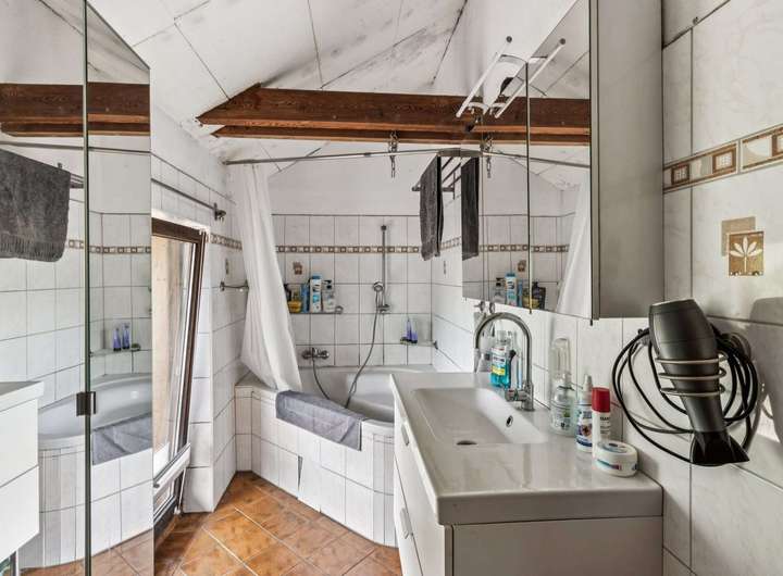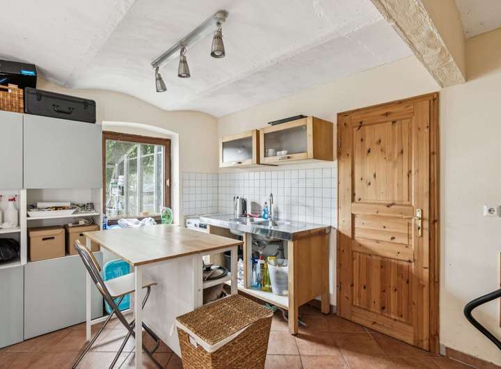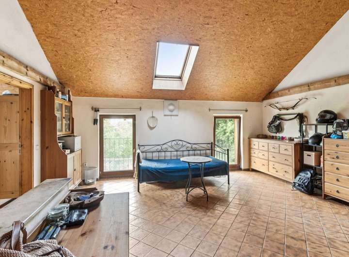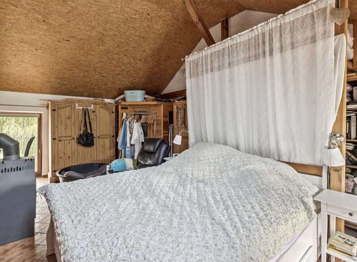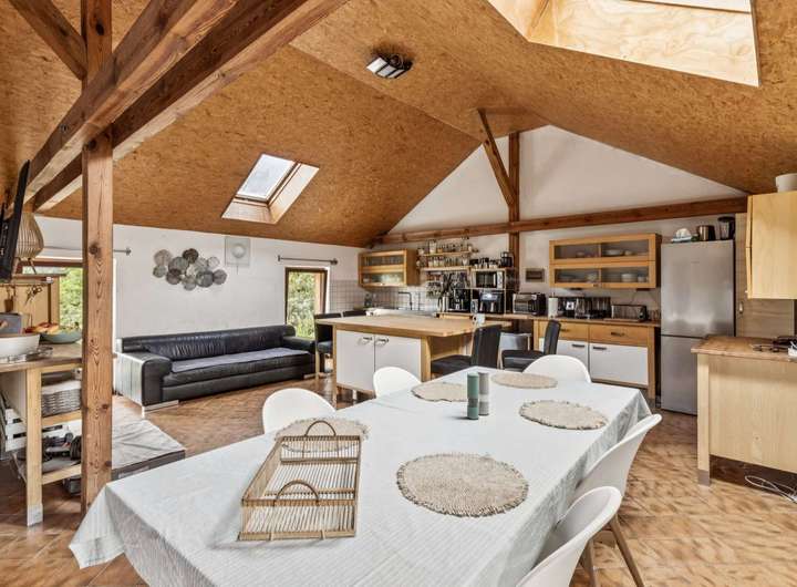 Im Dachgeschoss befinden sich ein großes Wohnzimmer mit offener Küche und moderner Einbauküche, ein Schlafzimmer mit Kaminofen, zwei weitere Zimmer sowie ein Badezimmer mit Badewanne.