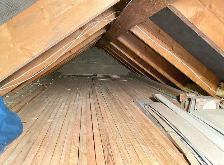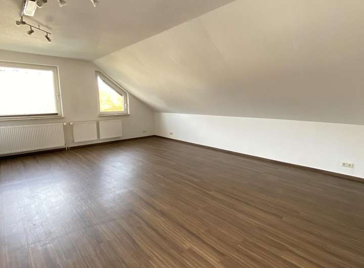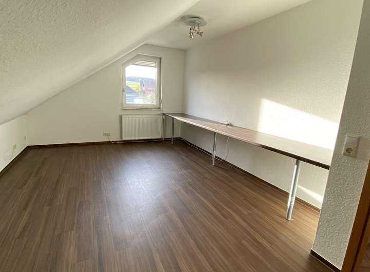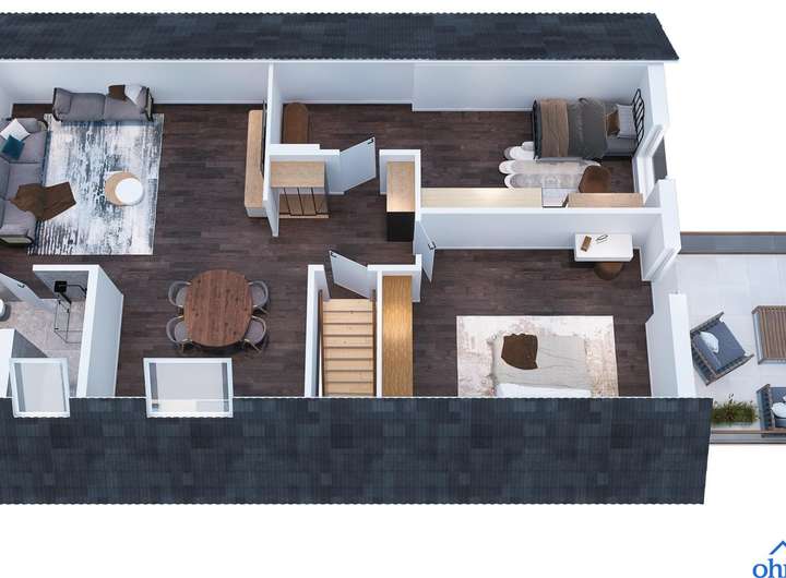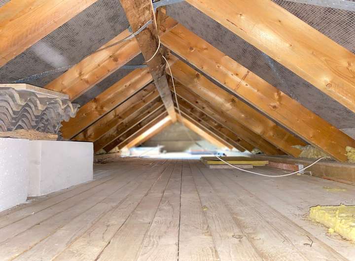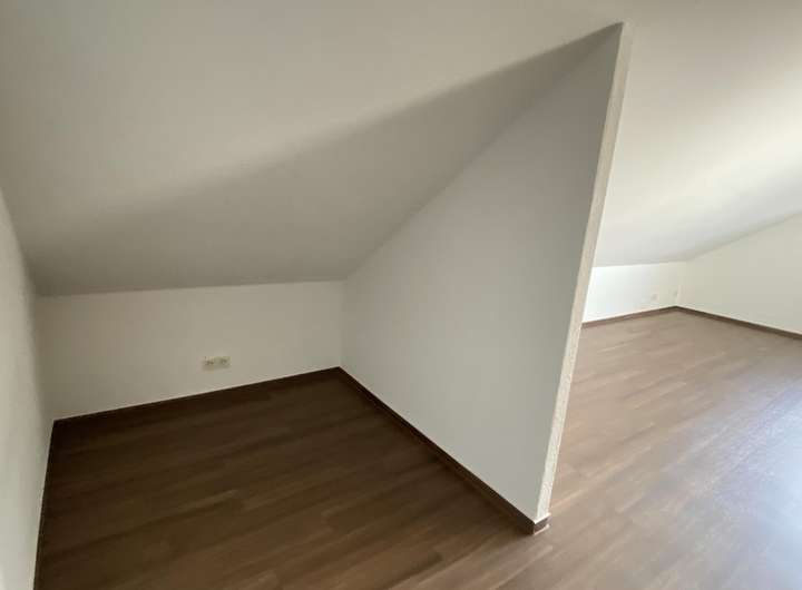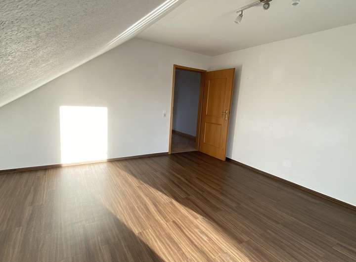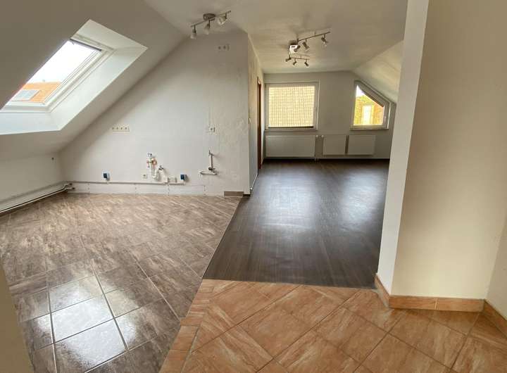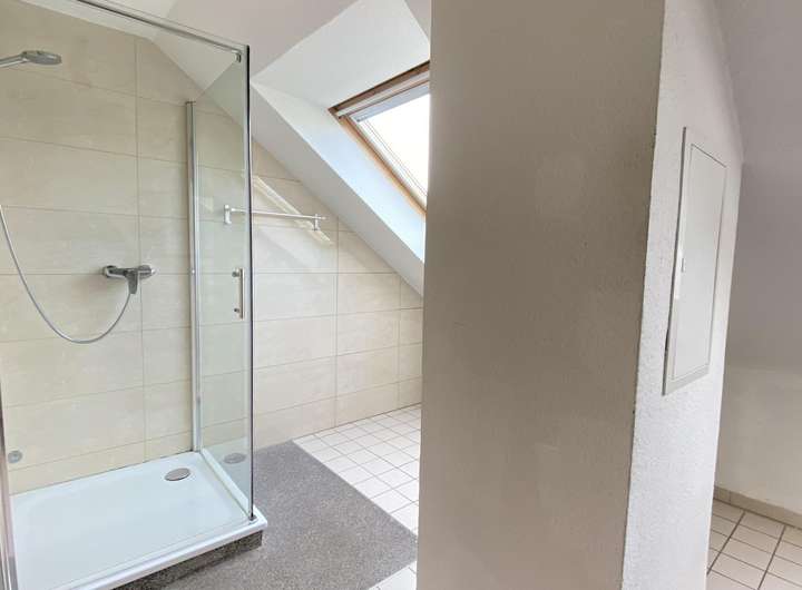 Im Obergeschoss erwartet Sie ein offener, großzügiger Wohnbereich, der ursprünglich als separate Wohnung genutzt wurde. Eine vollständige Küche kann hier problemlos wieder eingebaut werden - sämtliche Anschlüsse sind vorhanden. Der Raum ist aktuell offen gestaltet, da bei der Modernisierung 2015 eine Trennwand entfernt wurde, wodurch ein lichtdurchfluteter Wohn- und Kochbereich entstand. Ergänzt wird das Obergeschoss durch ein Schlafzimmer, ein weiteres Zimmer (ideal als Büro oder Atelier) sowie ein Badezimmer mit Dusche, WC und Waschbecken. Von dieser Etage aus gelangt man auf die große Dachterrasse, die 2025 vollständig mit einer neuen Umrandung versehen wurde.