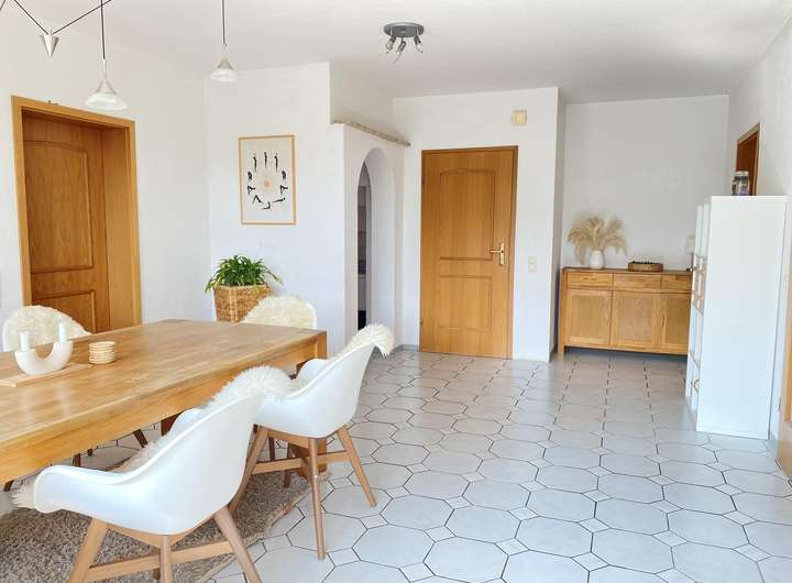 Der Zugang erfolgt über einen hellen Vorbau. Von dort gelangt man in den zentralen Flurbereich, von dem aus die elegante Marmortreppe ins Obergeschoss führt. Ebenfalls vom Flur erreichbar ist das Gäste-WC. Das Erdgeschoss bildet den Kern des Hauses: ein weitläufiger Essbereich mit mehreren Zugängen zu den angrenzenden Räumen. Hier befinden sich außerdem drei Zimmer, die sich flexibel als Schlafzimmer, Arbeits- oder Hobbyräume nutzen lassen, eine Küche, ein Badezimmer mit Dusche und Badewanne sowie ein großzügiger Hauswirtschafts- und Heizungsraum mit Fenster, der direkt von der Küche aus begehbar ist und als Technik- und Vorratsraum dient.