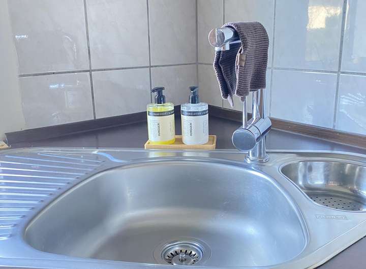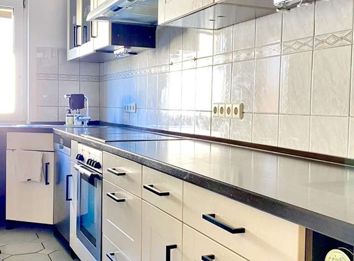 - Hochwertige, durchgehende Arbeitsplatte mit integrierter Franke-Eckspüle, maßgefertigt und vom Tischler eingebaut