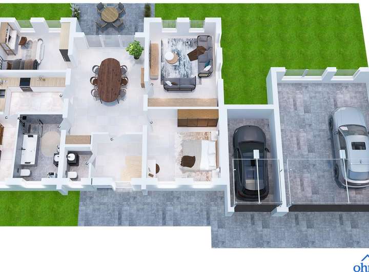 - Offener Wohn- und Kochbereich im Obergeschoss mit vollständigen Küchenanschlüssen