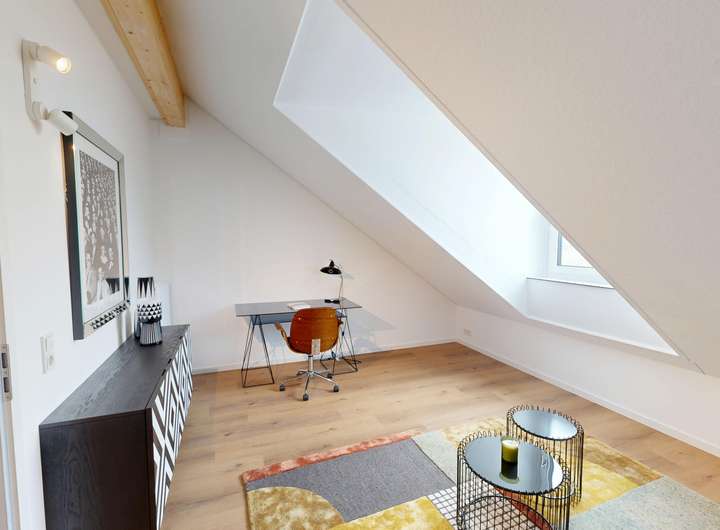 Im Dachgeschoss erwarten Sie zwei weitere Schlafzimmer sowie ein zweites Badezimmer. Beide Bäder sind hochwertig ausgestattet – mit Badewanne bzw. Walk-In-Dusche, Echtglasabtrennung, Handtuchheizkörpern und eleganter Sanitärausstattung. Der Anschluss für die Waschmaschine befindet sich im größeren der beiden Bäder.