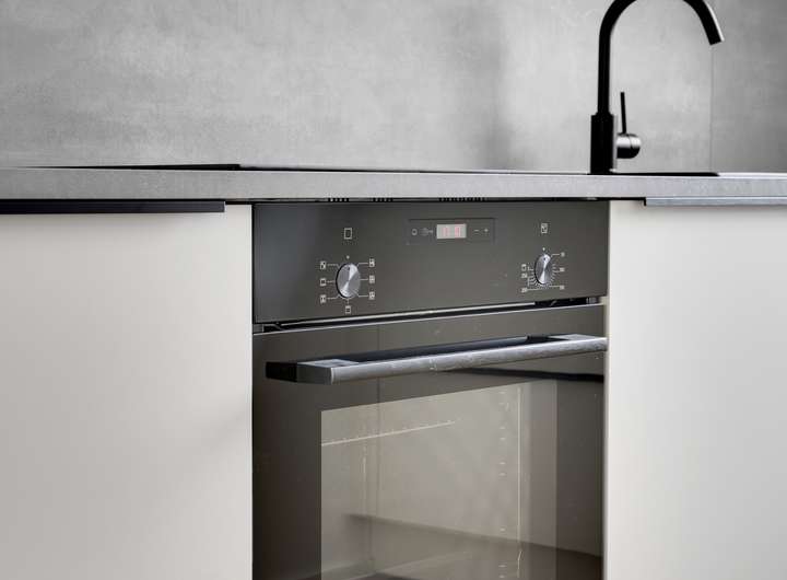 Die hochwertigen weißen Einbauküchen der Wohnhäuser verfügen über einen Backofen, ein Cerankochfeld, eine Spüle, eine Kühl- und Gefrierkombination sowie einen Geschirrspüler.