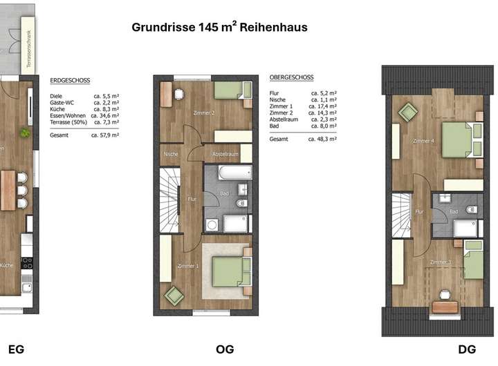 Die ca. 145 m² großen Neubauhäuser bieten Familien auf drei Etagen verteilt mit einem ca. 105 m² großen Grundstück ein naturnahes Wohnerlebnis mit einer nachhaltigen und umweltfreundlichen Konzeption, die zum Erhalt der umliegenden Naturschönheit beiträgt. Alle Reihenhäuser erfüllen den den KfW-40-Standard und werden mit einer zentralen Wärmepumpe beheizt und verfügen über Photovoltaik-Module auf den Dächern, die zusätzlichen PV-Strom liefern.
