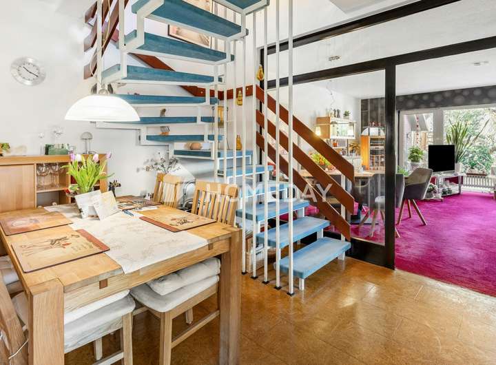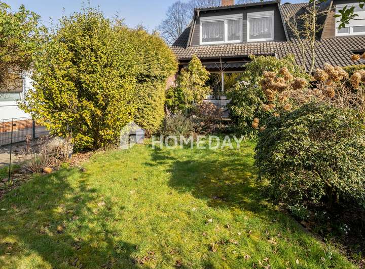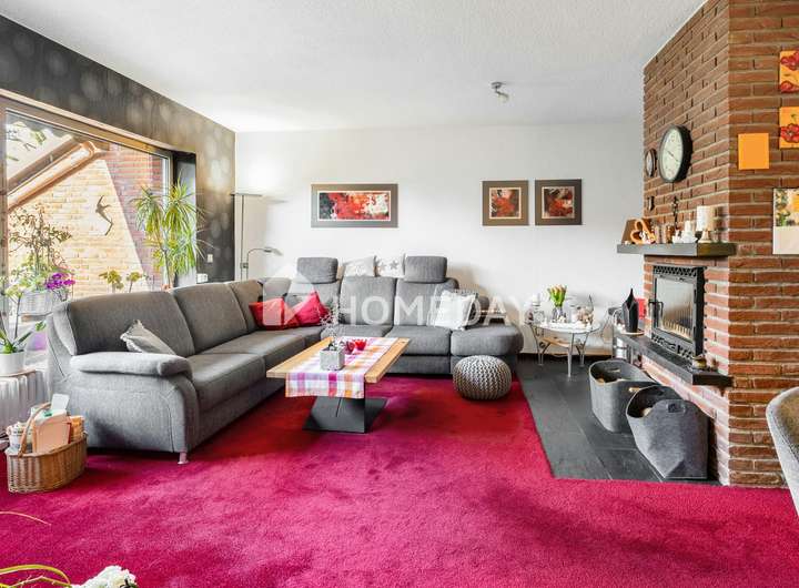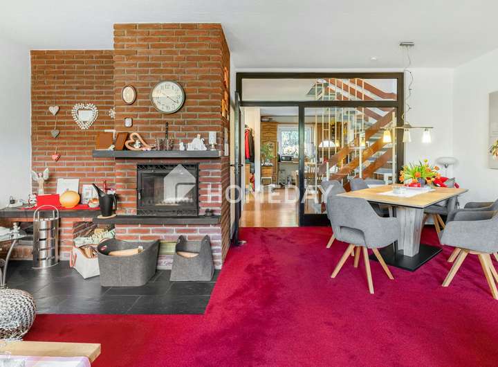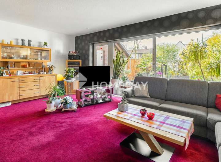 Der Wohnbereich im Erdgeschoss ist ein echtes Highlight: Ein großzügiges Wohnzimmer mit Mauerstein-Optik und einem stilvollen Kamin, der an kalten Tagen für eine gemütliche Atmosphäre sorgt. Das Wohnzimmer ist durch eine große Glasfront von den übrigen Räumen abgetrennt, was für eine offene und lichtdurchflutete Raumwirkung sorgt. Von hier aus gelangen Sie direkt auf die Terrasse, die mit einer Markise ausgestattet ist und sich ideal für entspannte Stunden im Freien eignet. Der angrenzende Garten mit 368 Quadratmetern bietet ausreichend Platz für Spiel und Erholung und lädt zum Verweilen ein. Zudem verfügt die Terrasse über einen praktischen Abstellraum.